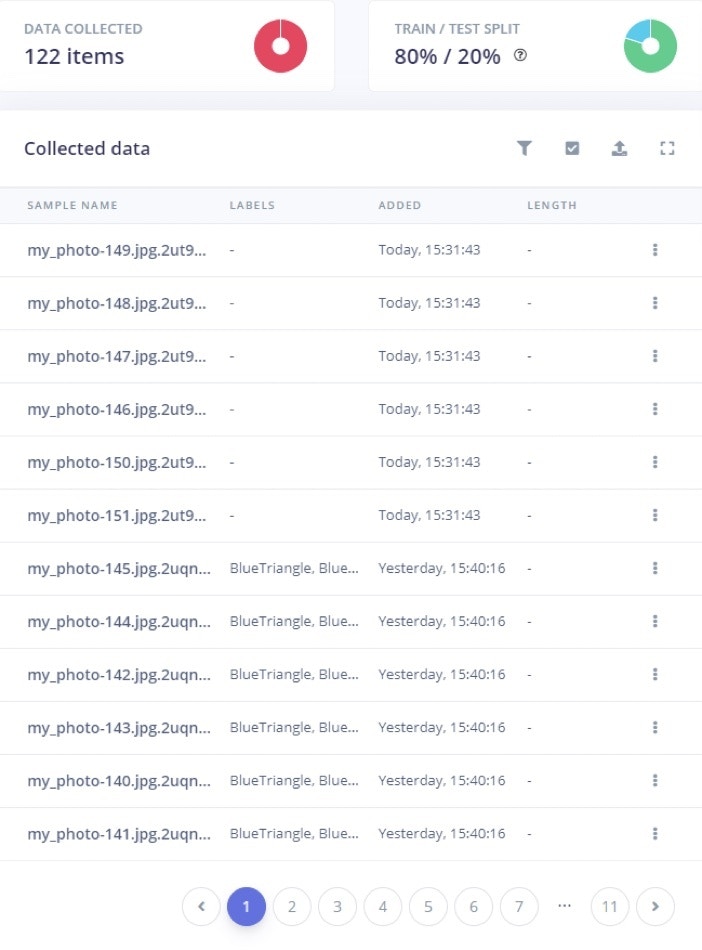 Once we have plenty of photos (we have collected around 115 pictures for our use case), it’s time to upload them to Edge Impulse and label them. Click on the upload button, select choose files, select all your photos and then begin uploading.