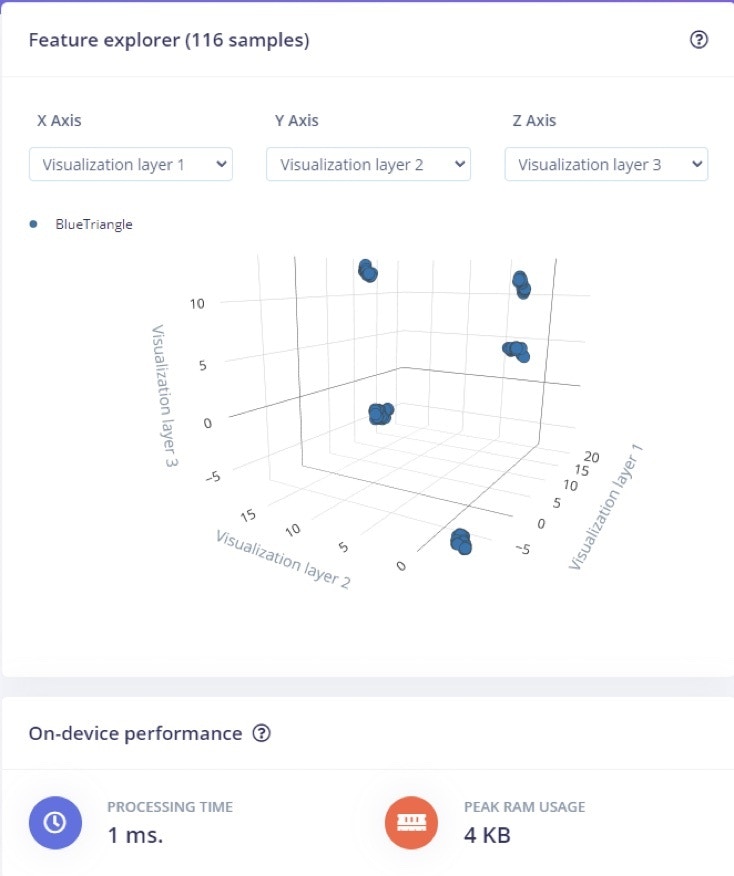 Next step, click on Save Impulse and move over to the Image field under the Impulse design panel. Wait for the parameters to be generated and click on Save parameters to move on to the Generate features tab, where you will click on the Generate features button. After the job is done, you can visualize your dataset in 3D, in the feature explorer tab. This is one of the most useful tools to use from the Edge Impulse platform as it can let you quickly validate whether your data is well clustered.