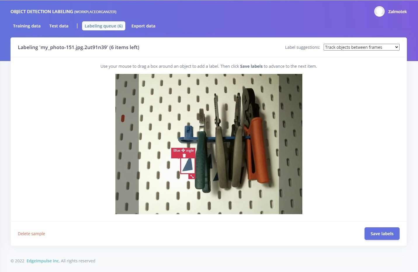Next, navigate to the Labeling queue and start drawing bounding boxes around the 3D printed markers. Even if it might feel cumbersome at first, Edge Impulse will start auto-labeling the object it recognizes, greatly speeding up the process.