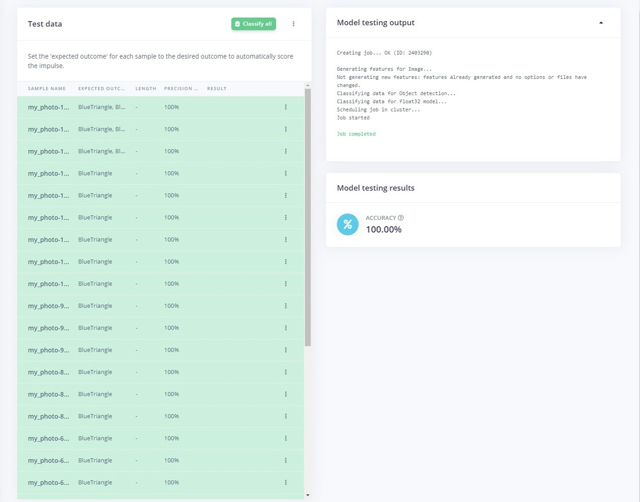 This is another great feature that allows you to run the inference on the Test data pool of images, that were kept apart from the training data. After clicking on Classify all, you will be prompted with the model testing results, which represents the percentage of all samples with precision score over 80%.