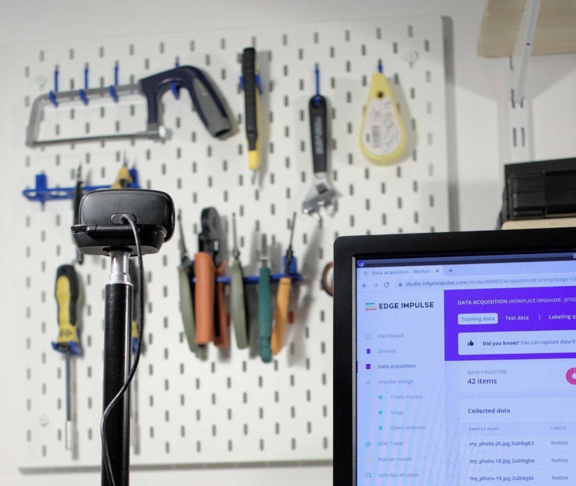 We believe the computer vision approach is the best in overcoming this obstacle and Edge Impulse offers the right tools for it. There are a few possible routes in creating an algorithm for detecting missing tools in their placeholder:- Train a model to recognize the different tools, define the number of each tool it must recognize at all times, and run an alert if any is missing;