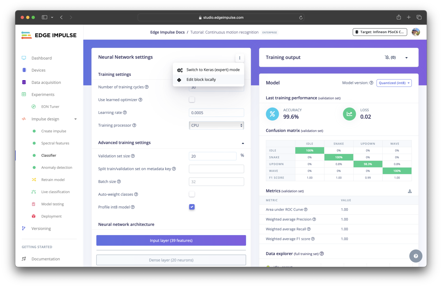 Expert modeIf you only want to make small modifications to the neural network architecture or loss function, you can instead use expert mode directly in Studio, eliminating the need to create a custom learning blocks. Go to any learning block settings page, select the three dots, and select Switch to Keras (expert) mode.