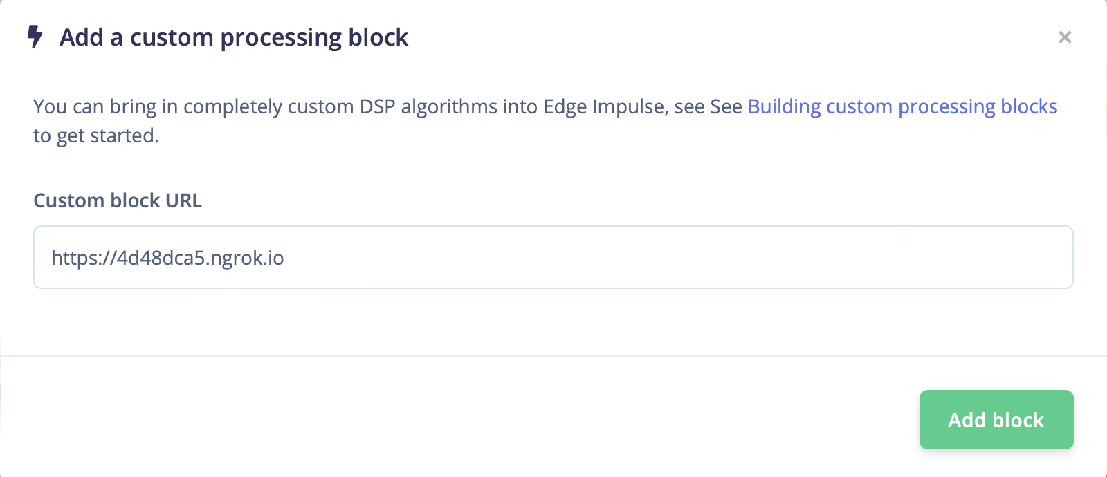 With a public URL for your custom processing block, you can go into your project and add a processing block to your impulse. When the processing block selection modal pops up, go to the bottom left corner and click theAdd custom block button. In the next modal that pops up, enter your forwarding URL from above and save. The block can now be used in your project and you will be able to view the processing results, including any visualizations you have created.
