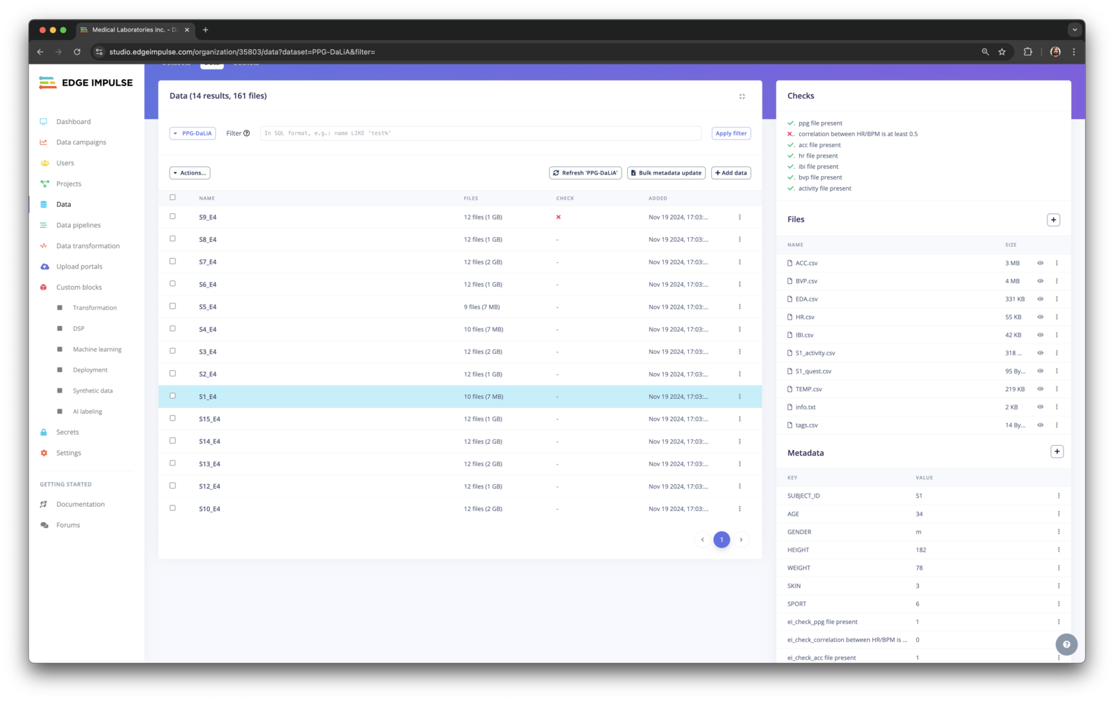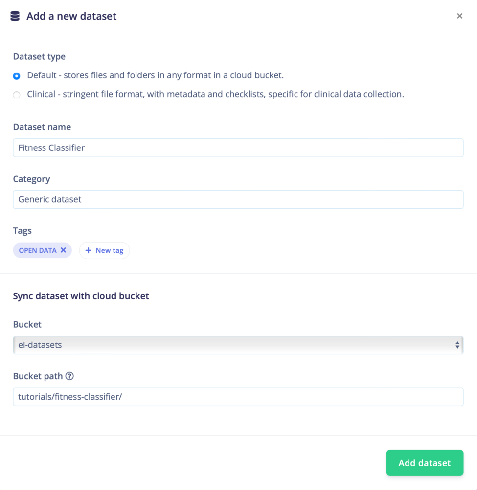 Two types of dataset structures can be used - Generic datasets (default) and Clinical datasets.There is no required format for data files. You can upload data in any format, whether it’s CSV, Parquet, or a proprietary data format.However, to import data items to an Edge Impulse project, you will need to use the right format as our studio ingestion API only supports these formats: