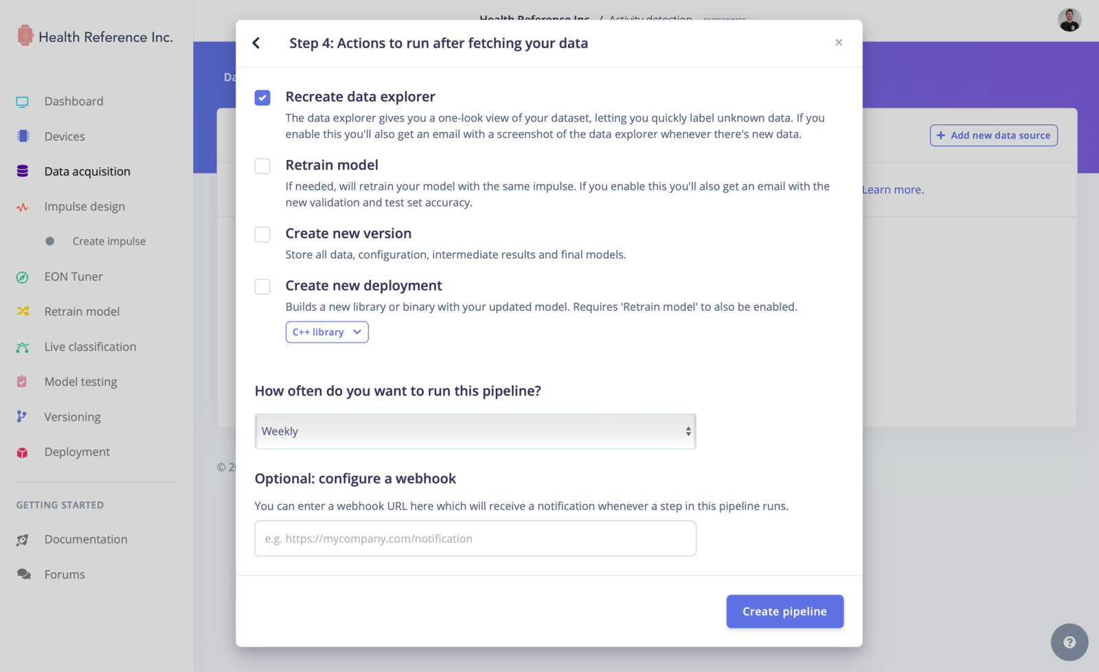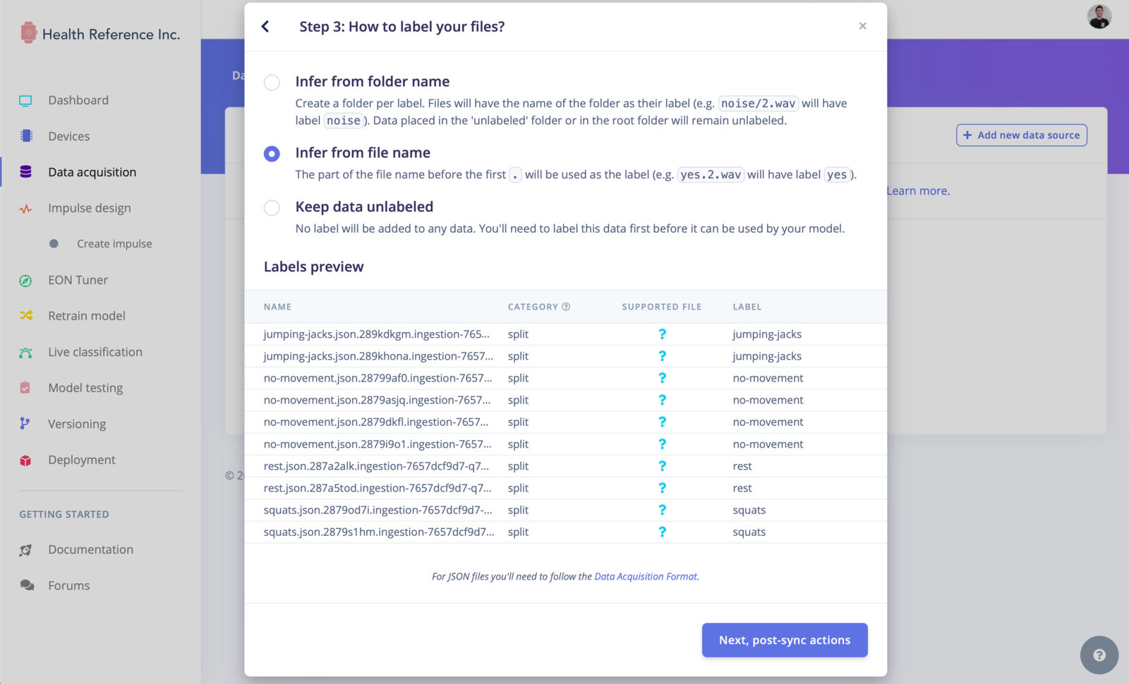 - JSON/CBOR files in the Edge Impulse data acquisition format