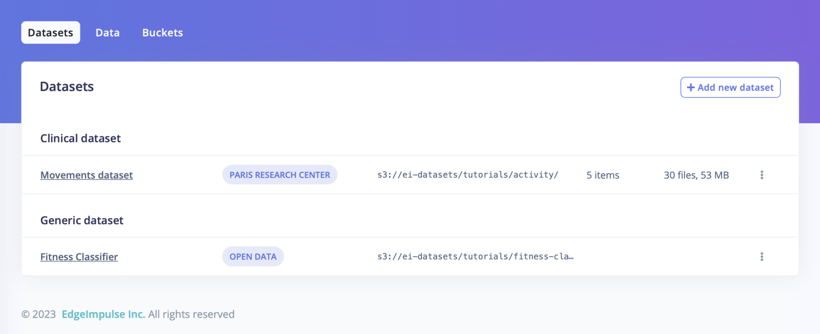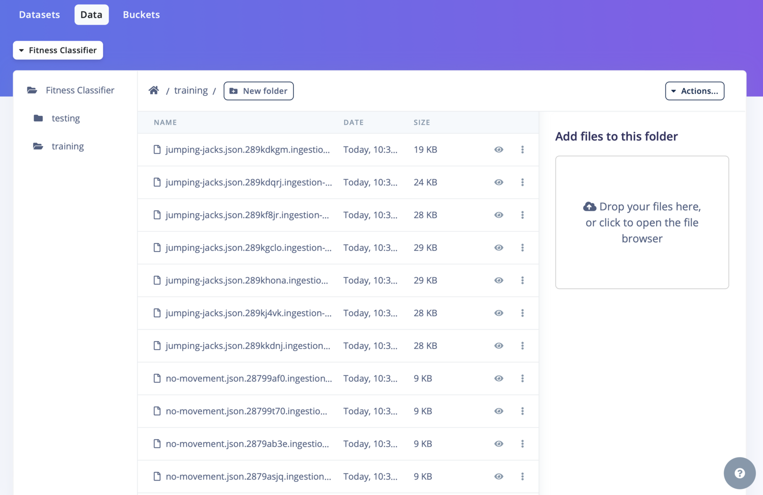 With your datasets imported, you can now navigate into your dataset, create folders, query your dataset, add data items and import your data to an Edge Impulse project.- Default dataset