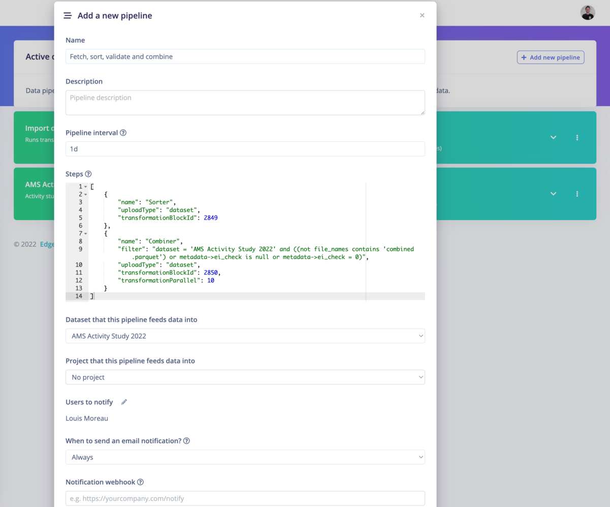 Another useful feature is to create a webhook to call a URL when the pipeline has ran. It will run a POST request containing the following information: