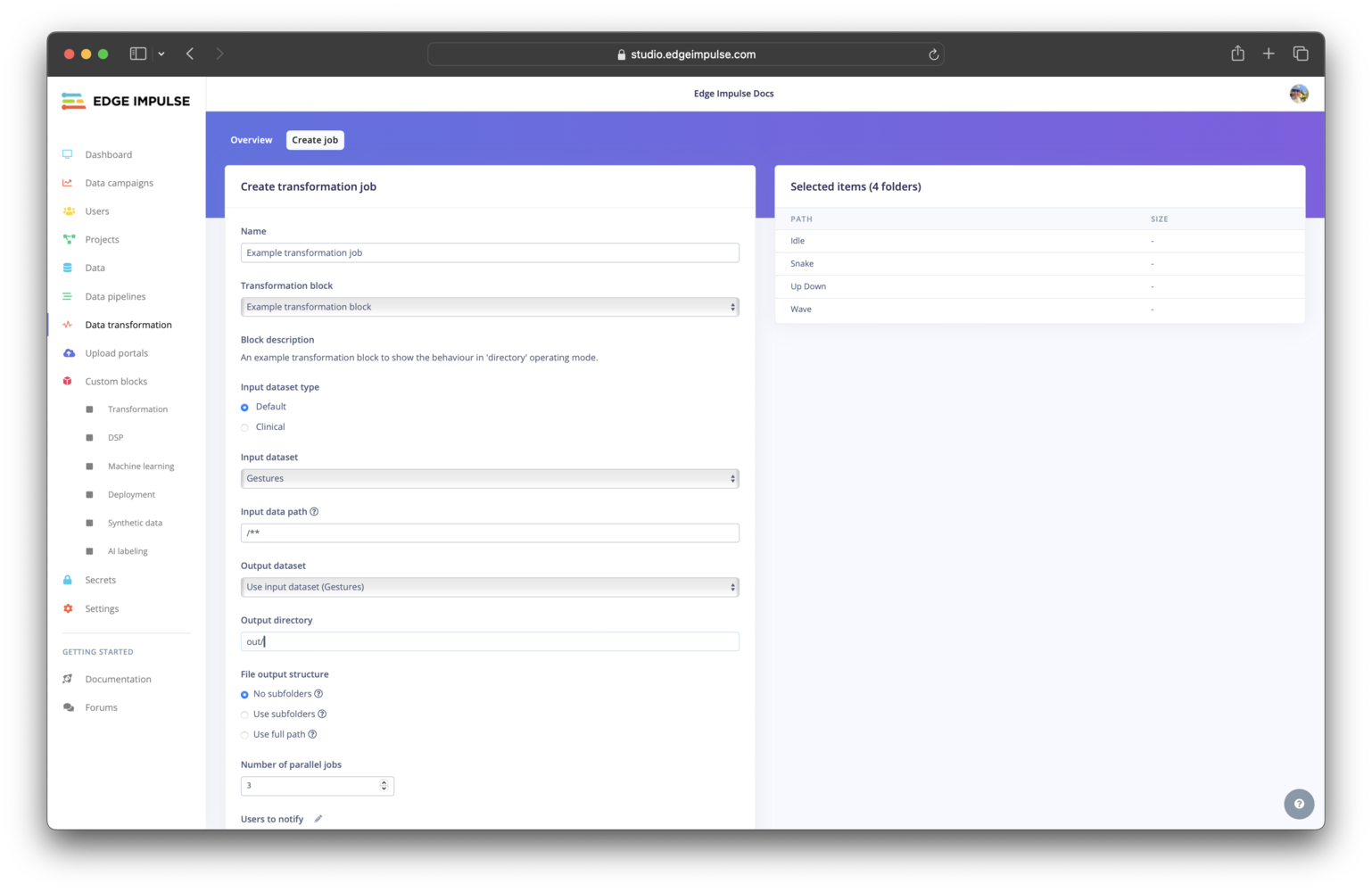 Transformation blocks that have been configured with the directory operating mode will only appear in the block dropdown for transformation jobs. As the name implies, directory transformation blocks operate on directories. The directory specified in the input data path field for the transformation job is automatically scanned for directories. Any directories that are found are shown on the right hand side as the selected items.