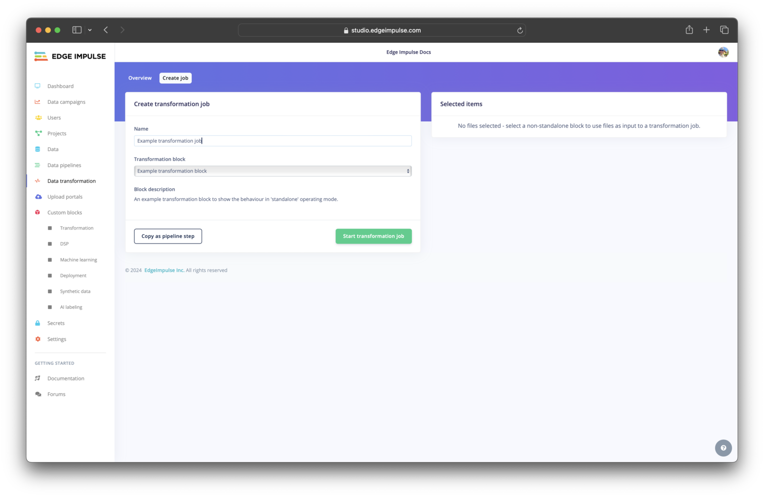 Transformation blocks that have been configured with the standalone operating mode can appear in the block dropdown for transformation jobs, for project data sources, or both depending on how the block has been set up. As the name implies, standalone transformation blocks do not operate on any files or directories. No dataset selection fields will be shown for standalone blocks when creating a transformation job. There will be no files or directories shown on the right hand side as the selected items.