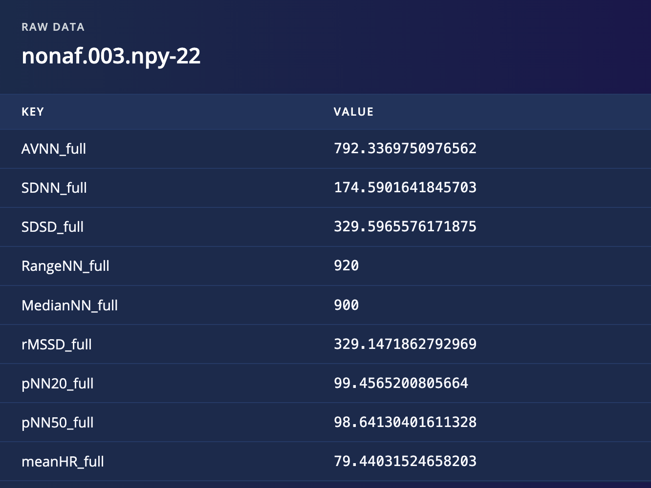 Preview the values of tabular non-time-series & pre-processed data samples: