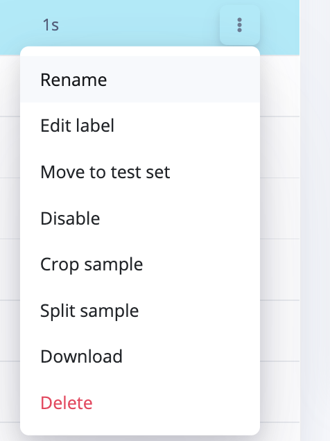 The data manipulations above can also be applied at the data sample level by simply navigating to the individual data sample by clicking on ”⋮” and selecting the type of action you might want to perform on the specific sample. This might be renaming, editing its label, disabling, cropping, splitting, downloading, and even deleting the sample when desired.