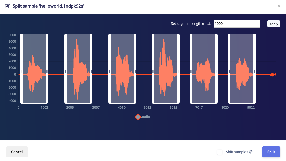 Besides cropping you can also split data automatically. Here you can perform one motion repeatedly, or say a keyword over and over again, and the events are detected and can be stored as individual samples. This makes it easy to very quickly build a high-quality dataset of discrete events. To do so head to Data Acquisition, record some new data, click, and select Split sample. You can set the window length, and all events are automatically detected. If you’re splitting audio data you can also listen to events by clicking on the window, the audio player is automatically populated with that specific split.