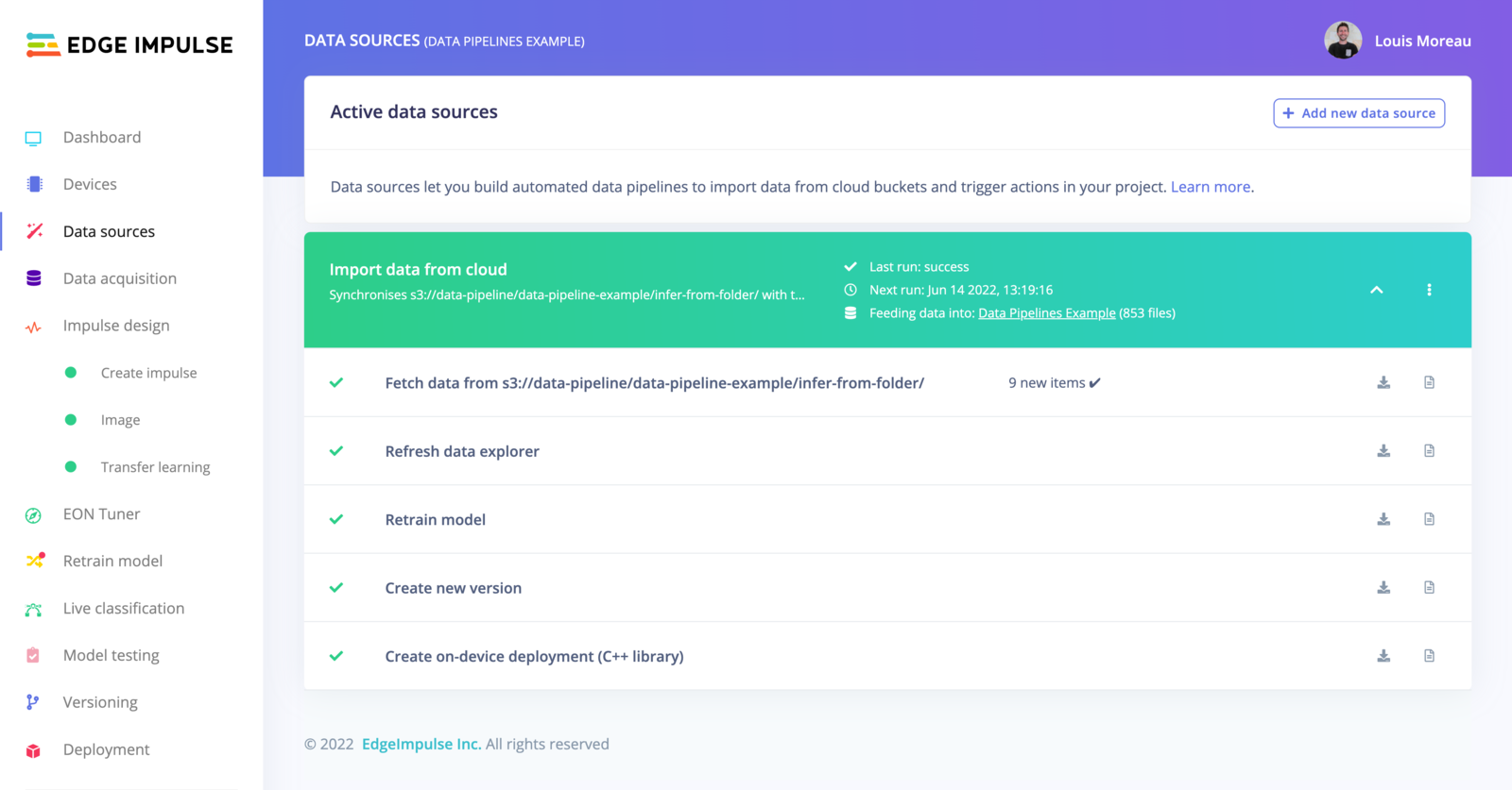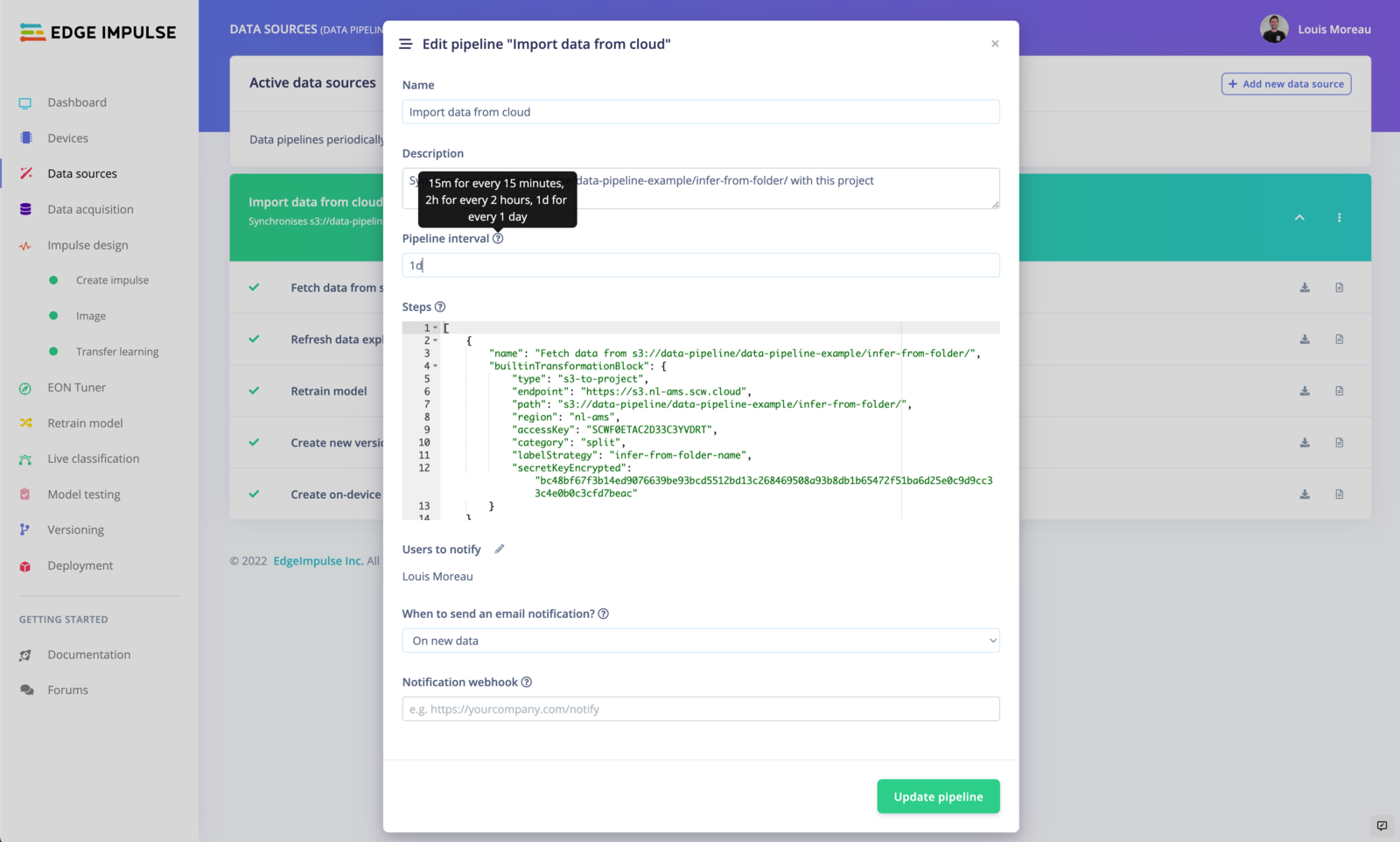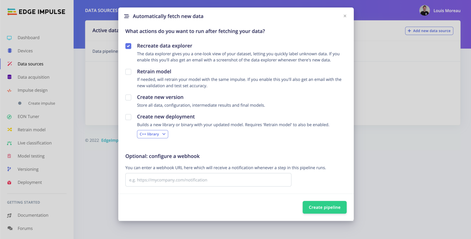 To run your pipeline from Edge Impulse studio, click on the⋮ button and select Run pipeline now.
