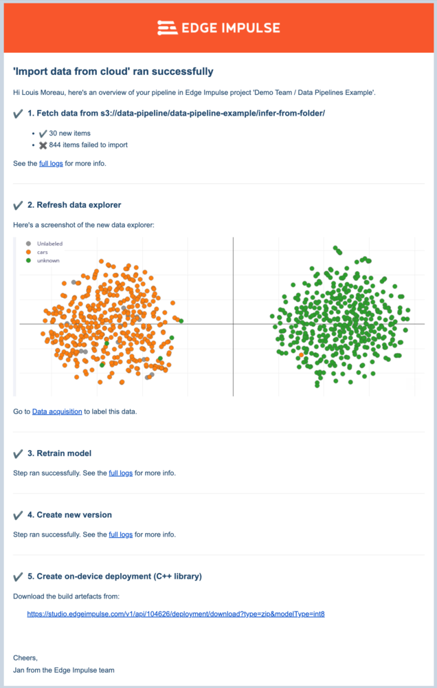 - Retrain model If needed, will retrain your model with the same impulse. If you enable this you’ll also get an email with the new validation and test set accuracy. Note: You will need to have trained your project at least once.