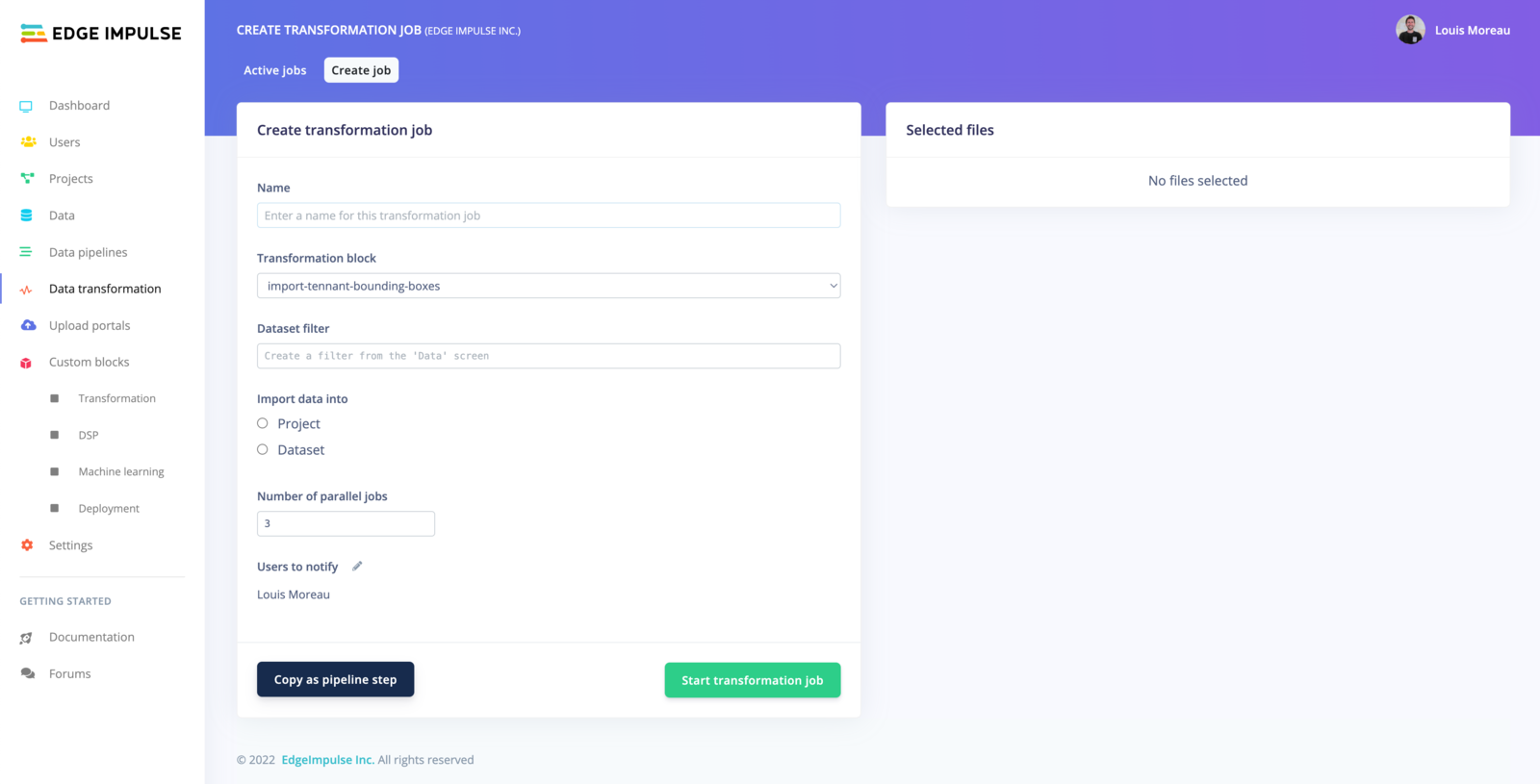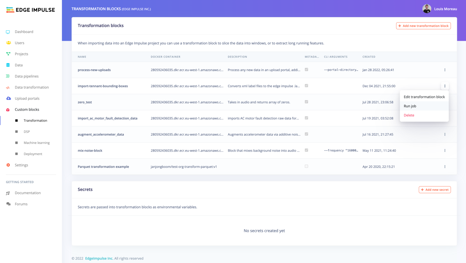 You can also trigger cloud jobs, known as transformation blocks, these are particularly useful if you want to generate synthetic datasets or automate tasks using the Edge Impulse API. We provide several pre-built transformation blocks available for organizations’ projects: