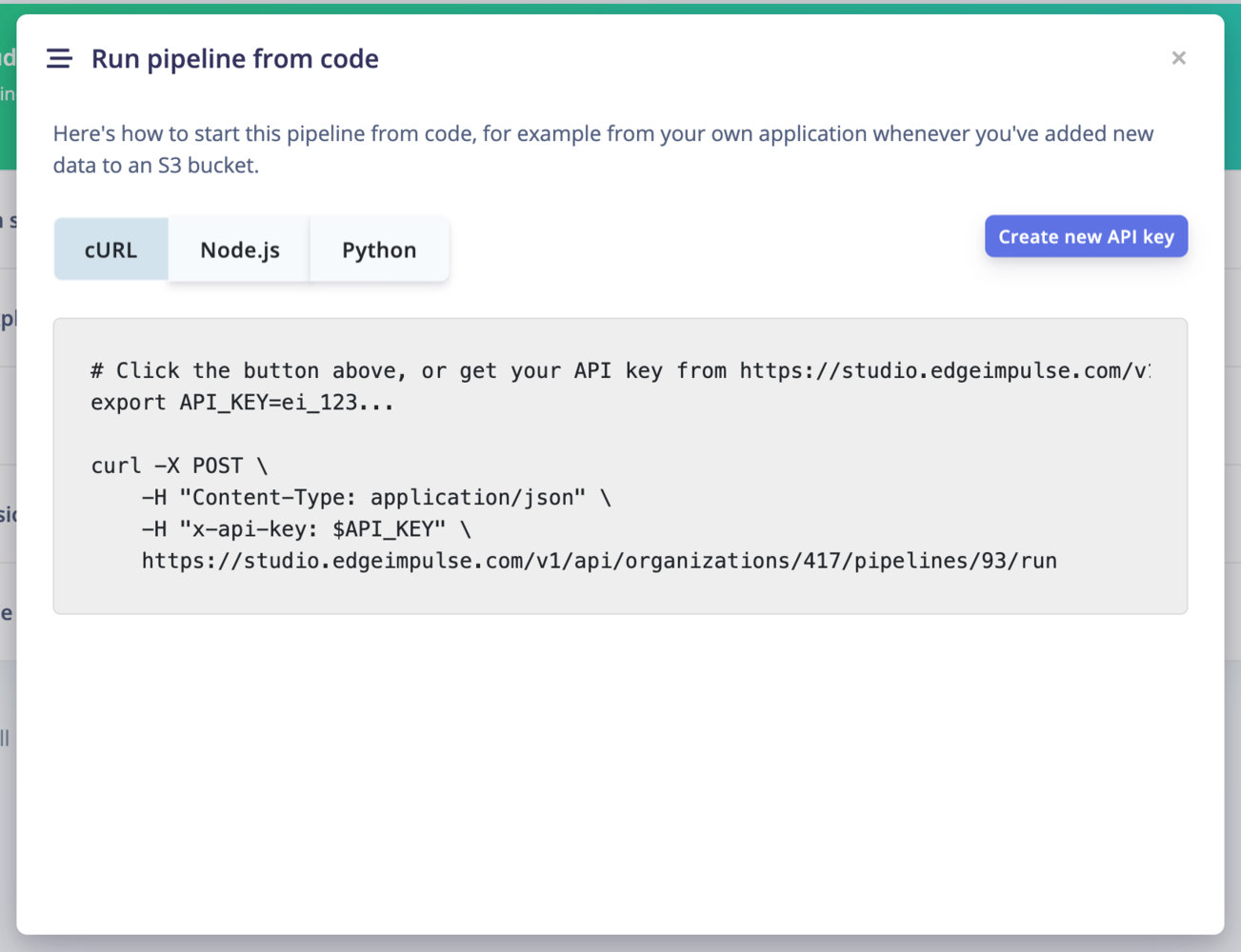 To run your pipeline from Edge Impulse studio, click on the⋮ button and select Run pipeline from code. This will display an overlay with curl, Node.js and Python code samples.