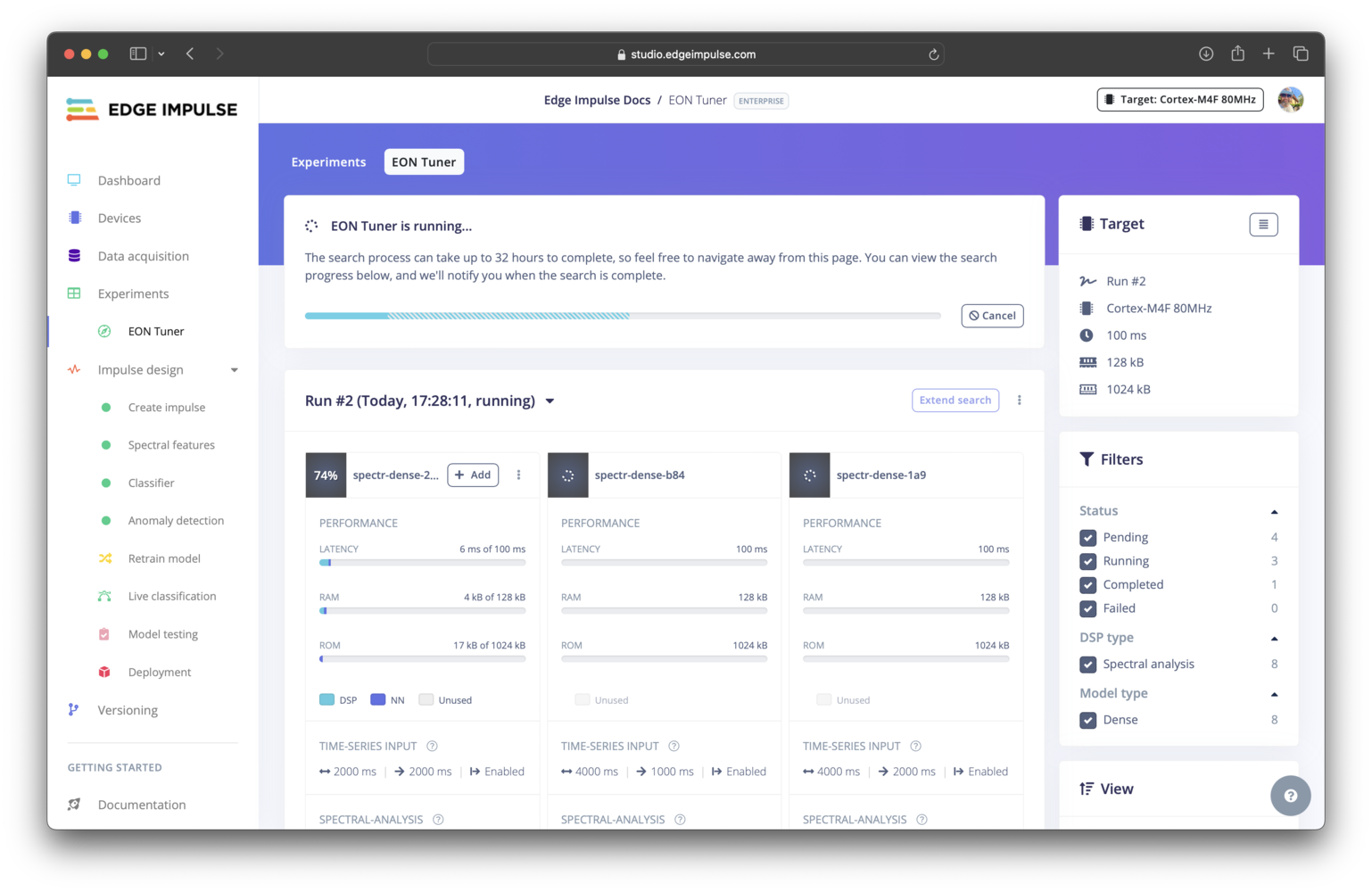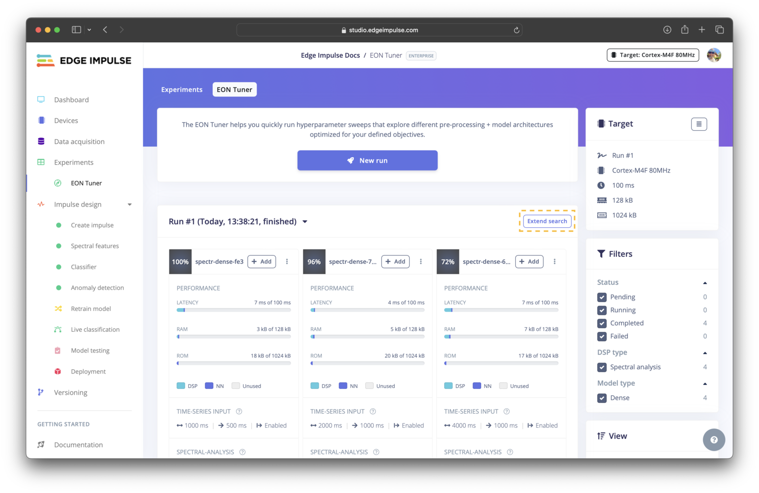 There are several approaches to exploring a parameter search space. For example, the most common methods include: manual search, random search, grid search, and Bayesian optimization. The EON Tuner has been updated to use Bayesian optimization (previously random search). Compared to the other techniques listed, Bayesian optimization is a more efficient and effective option. It is a “smarter” algorithm that learns from prior results by building a probabilistic model based on these results, the possible parameter values, and your objectives to determine what area of the search space to explore next. This leads to improved results in a shorter amount of time using fewer compute resources.Getting started