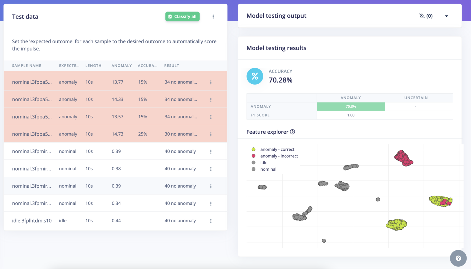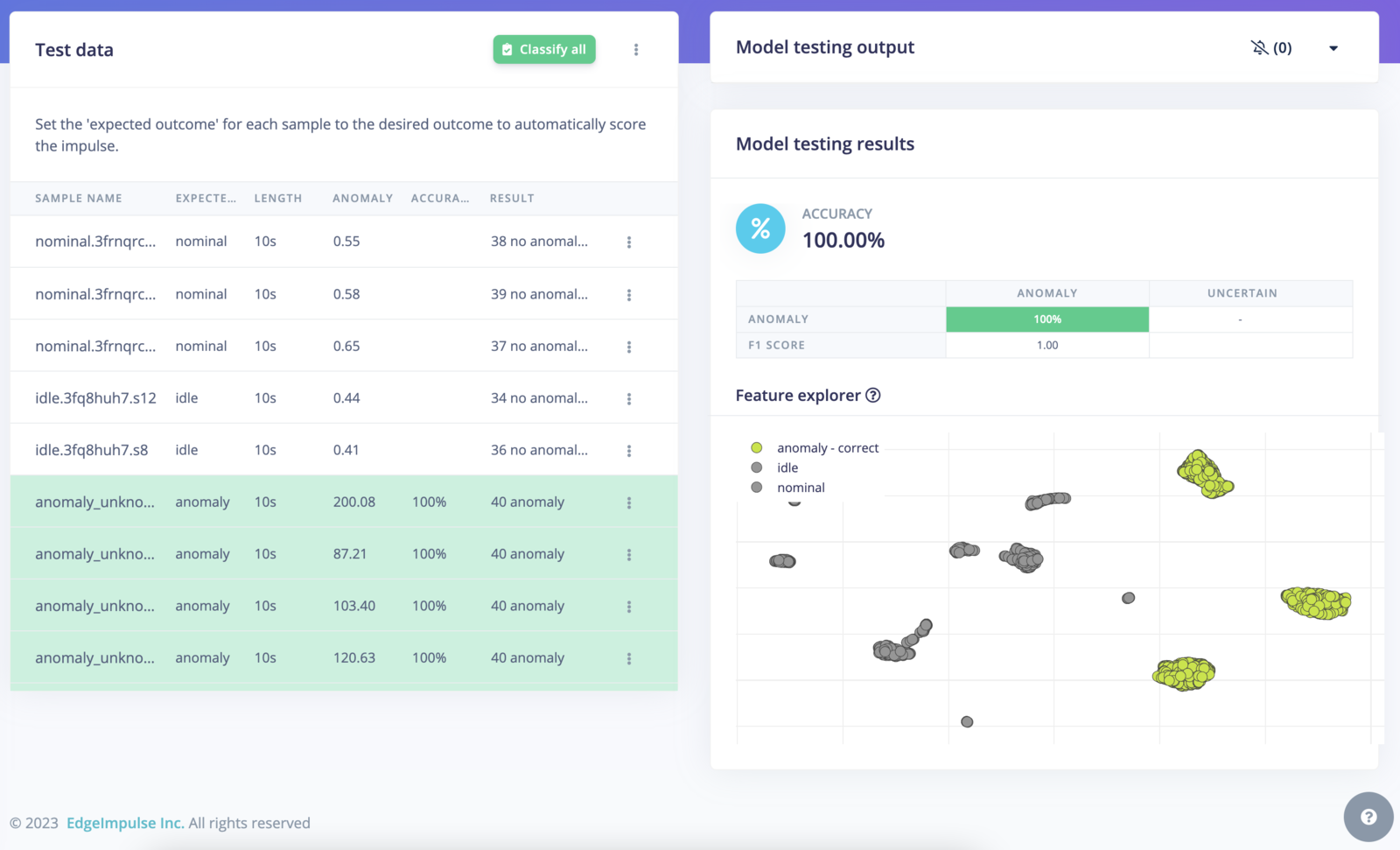 In the example above, you will see that some samples are considered asno anomaly while the expected output is an anomaly. If you take a closer look at the anomaly score for non anomaly samples, the range values are below 1.00: