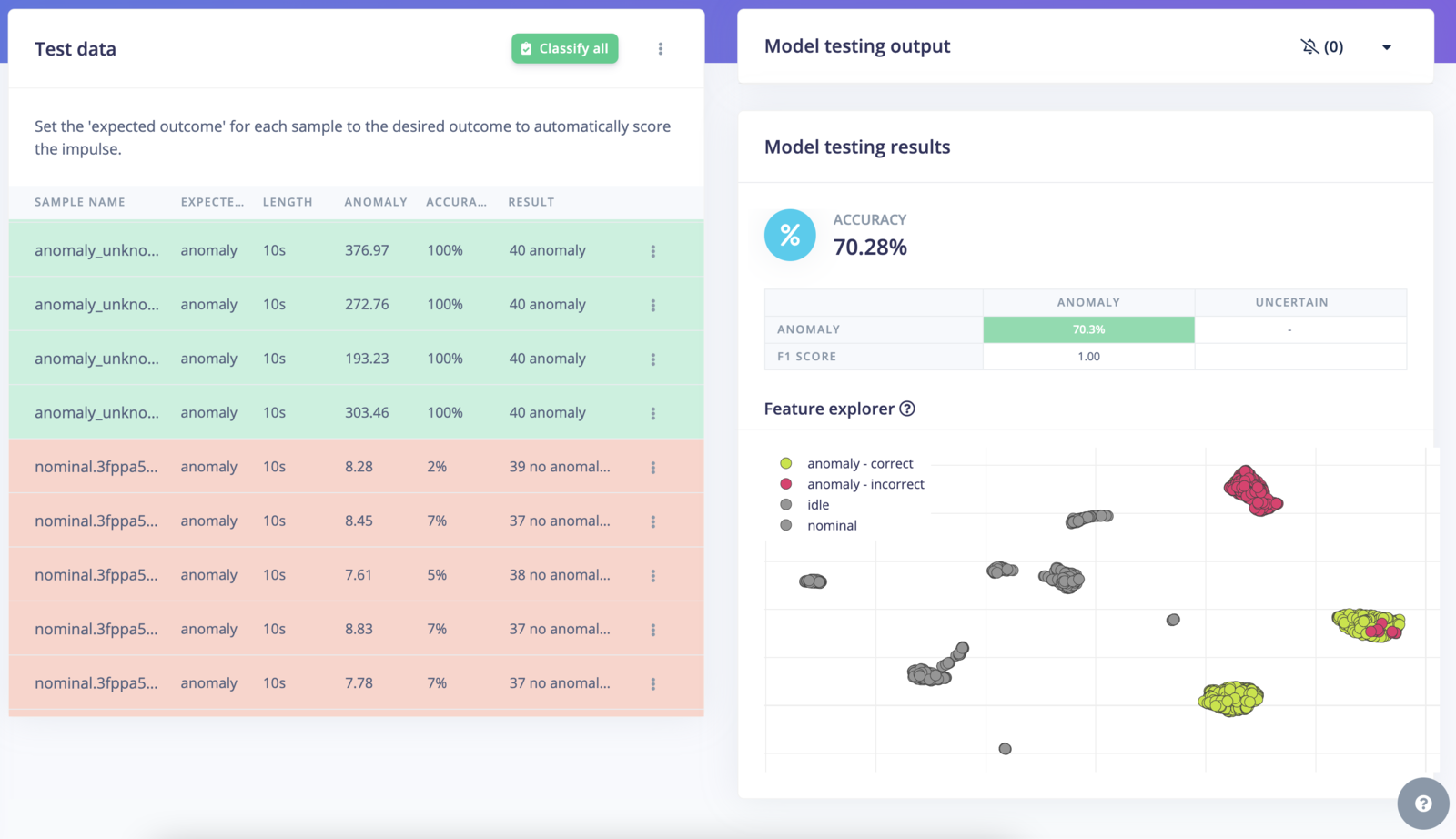 The different axes correspond to the generated features from the pre-processing block. The chosen axes will use the features as the input data for the training.Click on the Select suggested axes button to harness the results of the feature importance output.