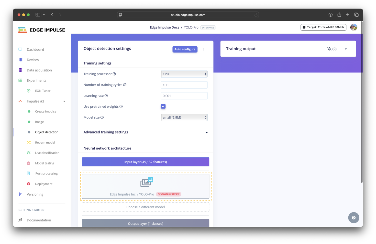 Select YOLO-Pro as your neural network architecture on the settings page for the object detection learning block.
