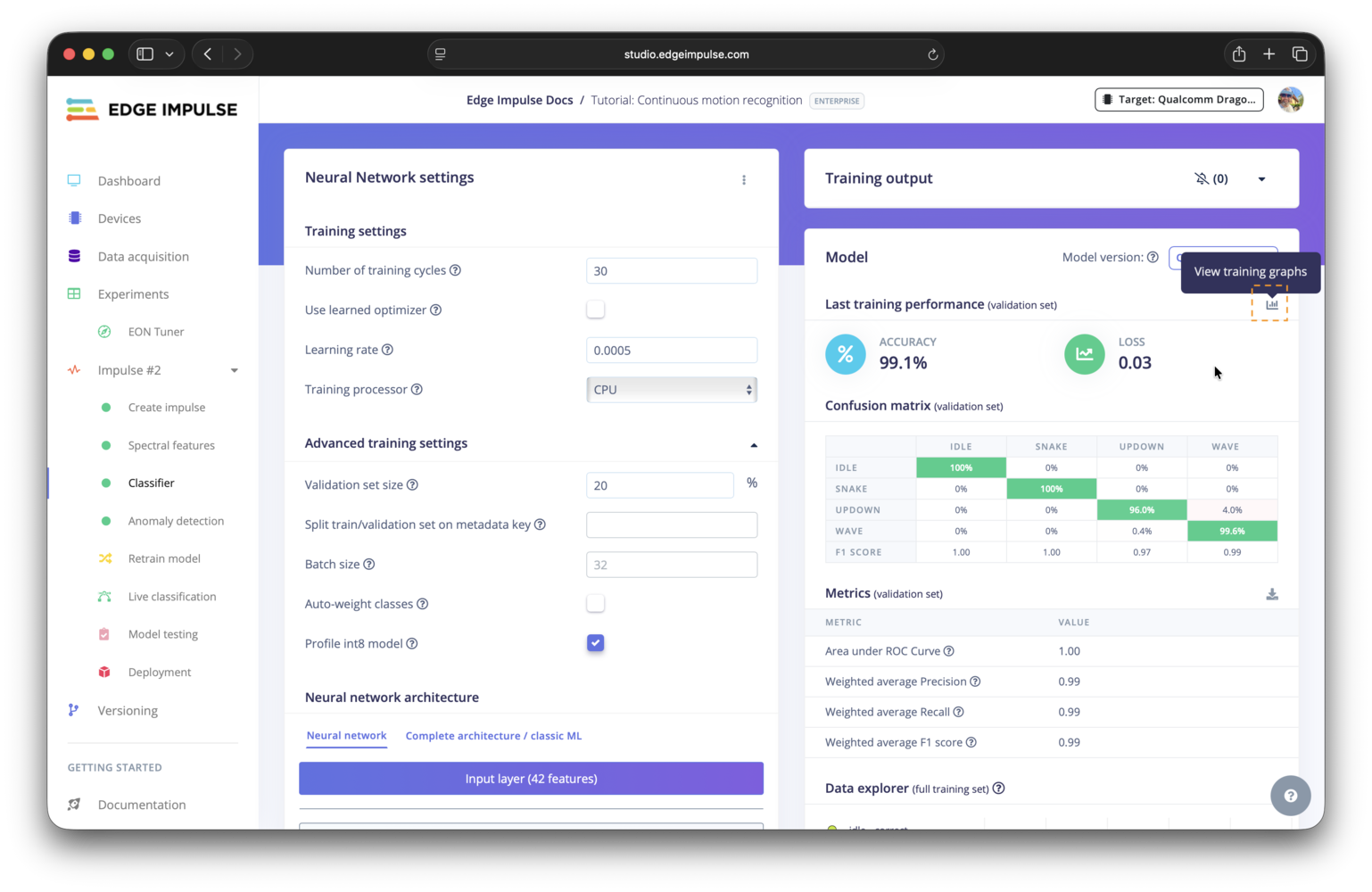 On the learning block page, after training is complete, you can view the validation accuracy and loss graphs by clicking the graphs icon near the top right of the model performance overview pane. This will open a modal displaying the graphs, allowing you to analyze the performance of your model over the training epochs.