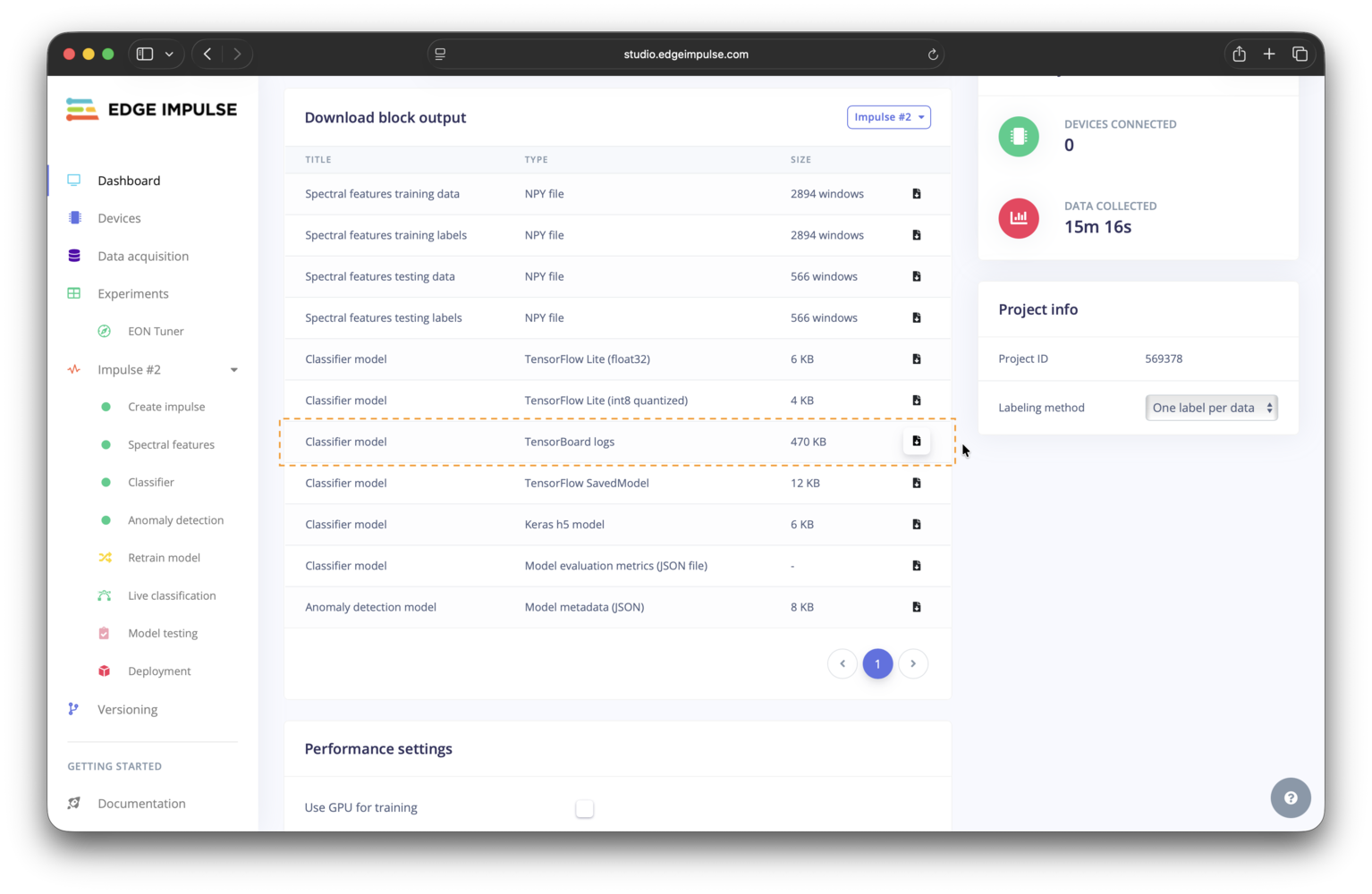 You can export the TensorBoard logs for your learning block to analyze them locally or share them with others. The logs can be downloaded from your project dashboard, under the download block output section.