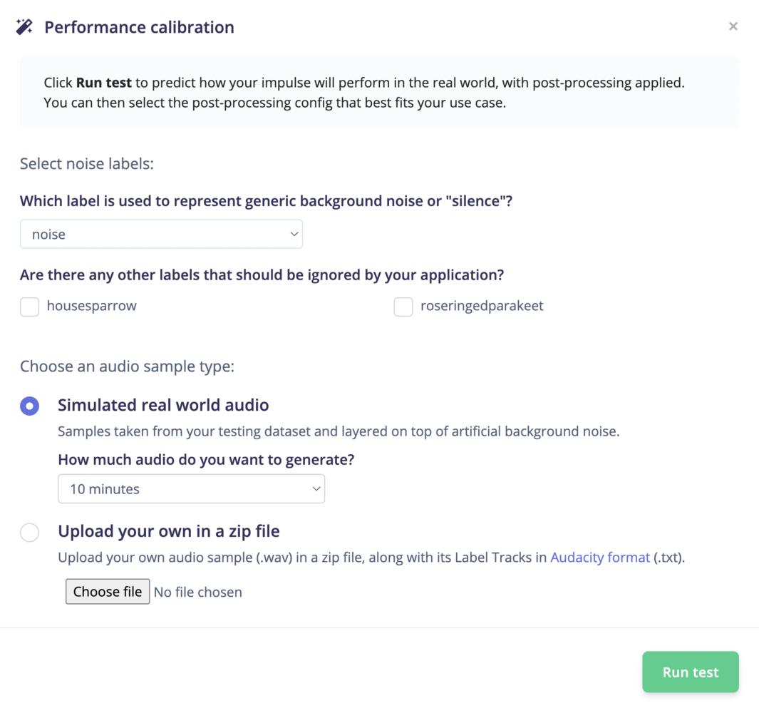 First, make sure you have an audio project in your Edge Impulse account. No projects yet? Follow one of our tutorials to get started: Or, clone the “Bird sound classifier” project that is used in this documentation to your Edge Impulse account: https://studio.edgeimpulse.com/public/16060/latest Once you’ve trained your impulse, select the Performance calibration tab and set your testing configuration settings: