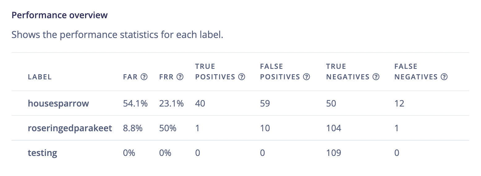 Currently only available for Audio data projectsPerformance calibration is currently only available for projects that contain audio data. It’s designed for use with projects that are detecting specific events (such as spoken keywords), as opposed to classifying ambient conditions. Please stay tuned for future information on support for other types of sensor data!