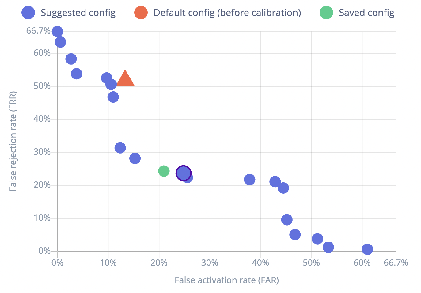 Your impulse can be configured with a post-processing algorithm that will minimize either false activations or false rejections. The chart shows a range of suggested configs. If you save one, it will be used when your impulse is deployed.