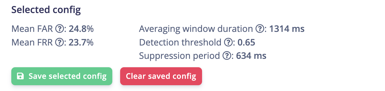 Selecting from the various “Suggested config” icons on the FRR/FAR chart will update the Selected config information. Click on Save selected config to use the selected FAR and FRR trade off when your impulse is deployed. This config information is also accessible in the deployed Edge Impulse library.