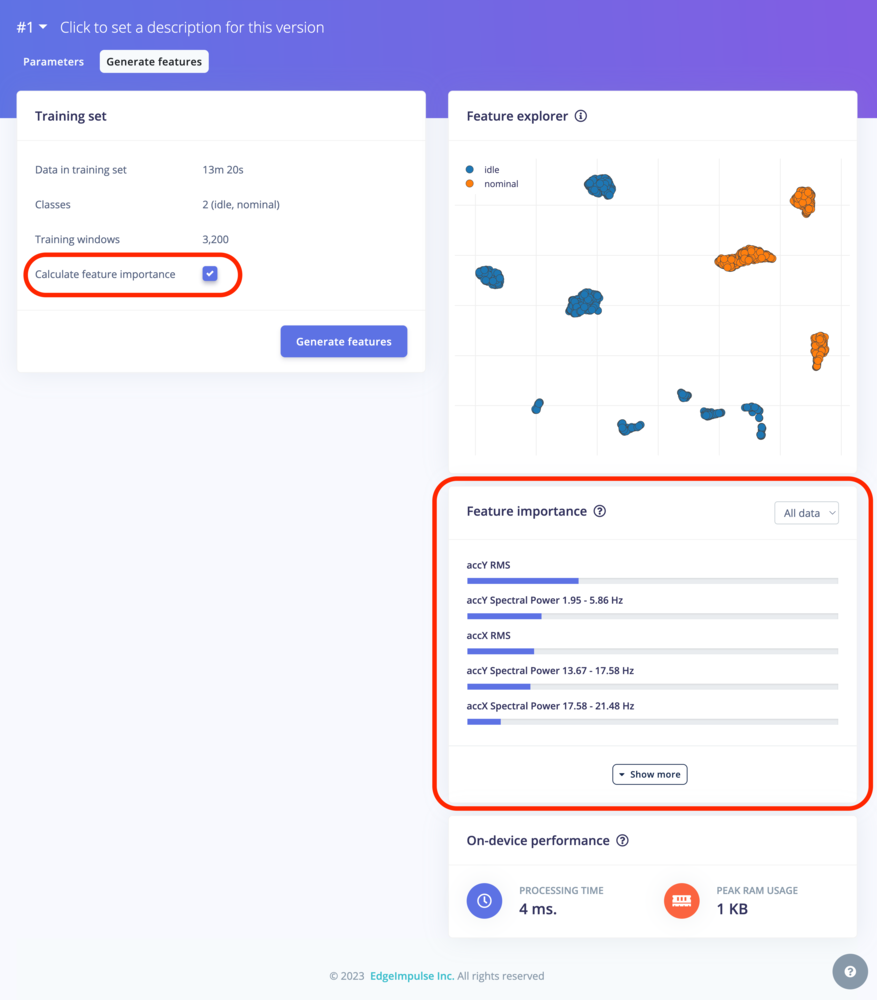 In most of our DSP blocks, you have the option to calculate the feature importance. Edge Impulse Studio will then output a Feature Importance list that will help you determine which axes generated from your DSP block are most significant to analyze when you want to train a model.