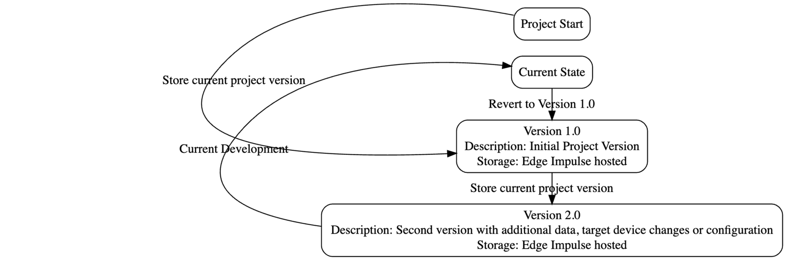 Edge Impulse provides a straightforward versioning system that allows you to create and manage versions of your projects. Each version captures the current state of your project, including data, configurations, models, and settings. This is comparable to how a Git commit captures the state of a codebase at a particular point in time. The following diagram illustrates the workflow for creating and managing versions in Edge Impulse: