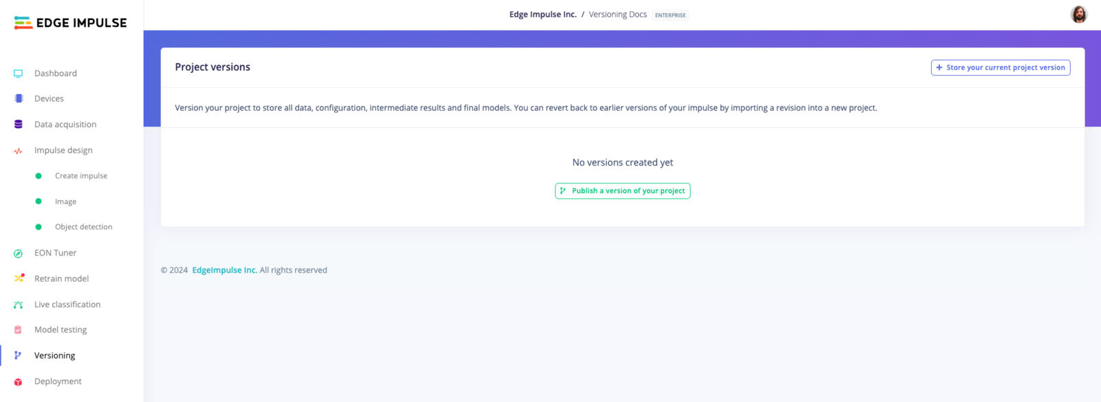 To create a version of your project, follow these steps:- Navigate to Your Project: Open the project you want to version in the Edge Impulse Studio.