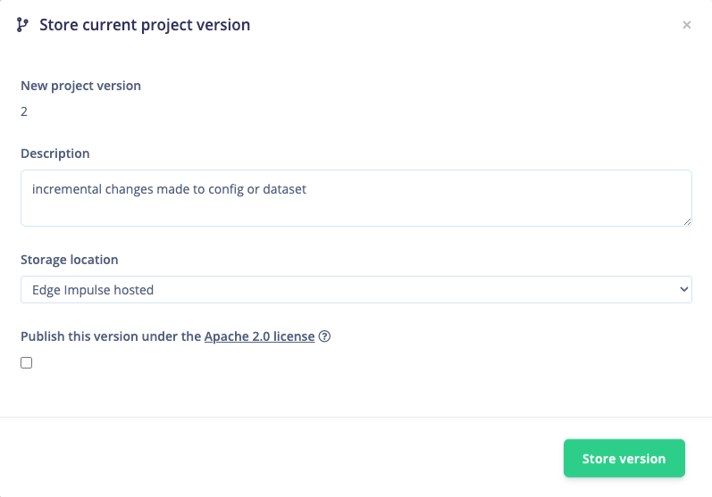 If you want to reference your project in the Edge Impulse public project repository, check the Publish this version under the Apache 2.0 license. This is a great way to share your work with the community.