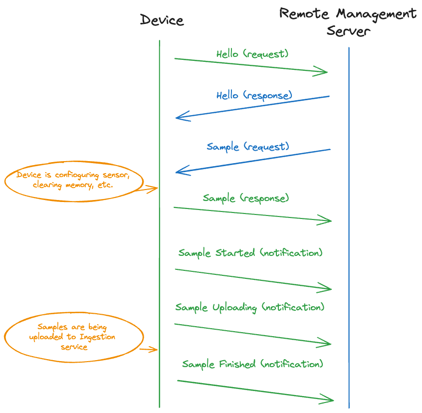 When a user requests sampling through the Studio, the following message is sent to the device. The device needs to perform a handshake with the hello message first. This message can be sent by the server only.
