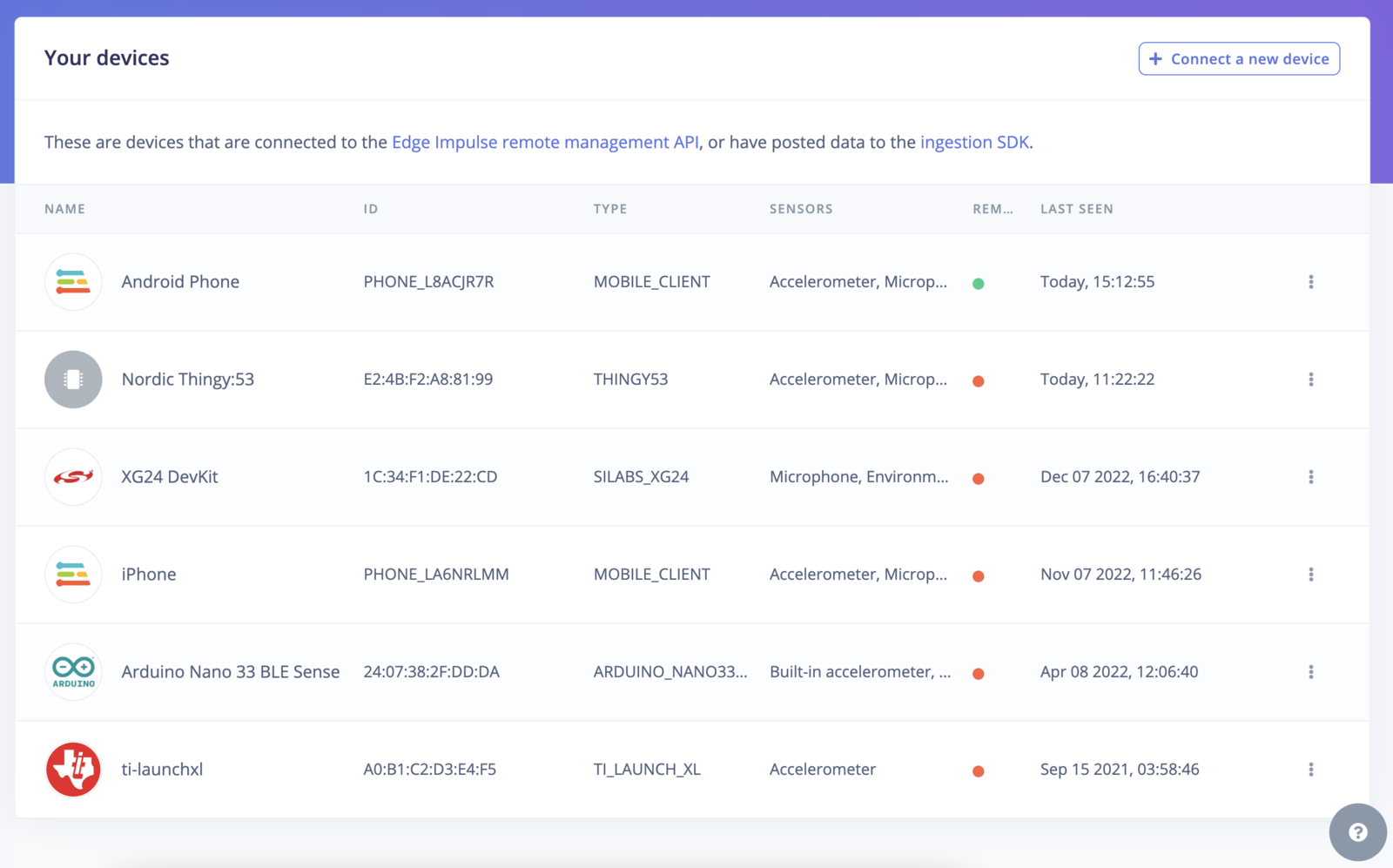 For this tutorial, you’ll need a supported device. Alternatively, use the either Data forwarder or Edge Impulse for Linux SDK to collect data from any other development board, or your mobile phone. If your device is connected (green dot) under Devices in the studio you can proceed: