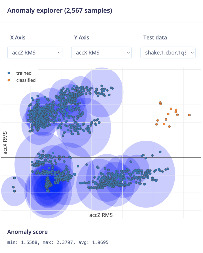 Neural networks are great, but they have one big flaw. They’re terrible at dealing with data they have never seen before (like a new gesture). Neural networks cannot judge this, as they are only aware of the training data. If you give it something unlike anything it has seen before it’ll still classify as one of the four classes. Let’s look at how this works in practice. Go to ‘Live classification’ and record some new data, but now vividly shake your device. Take a look and see how the network will predict something regardless. So, how can we do better? If you look at the feature explorer, you should be able to visually separate the classified data from the training data. We can use this to our advantage by training a new (second) network that creates clusters around data that we have seen before, and compares incoming data against these clusters. If the distance from a cluster is too large you can flag the sample as an anomaly, and not trust the neural network.