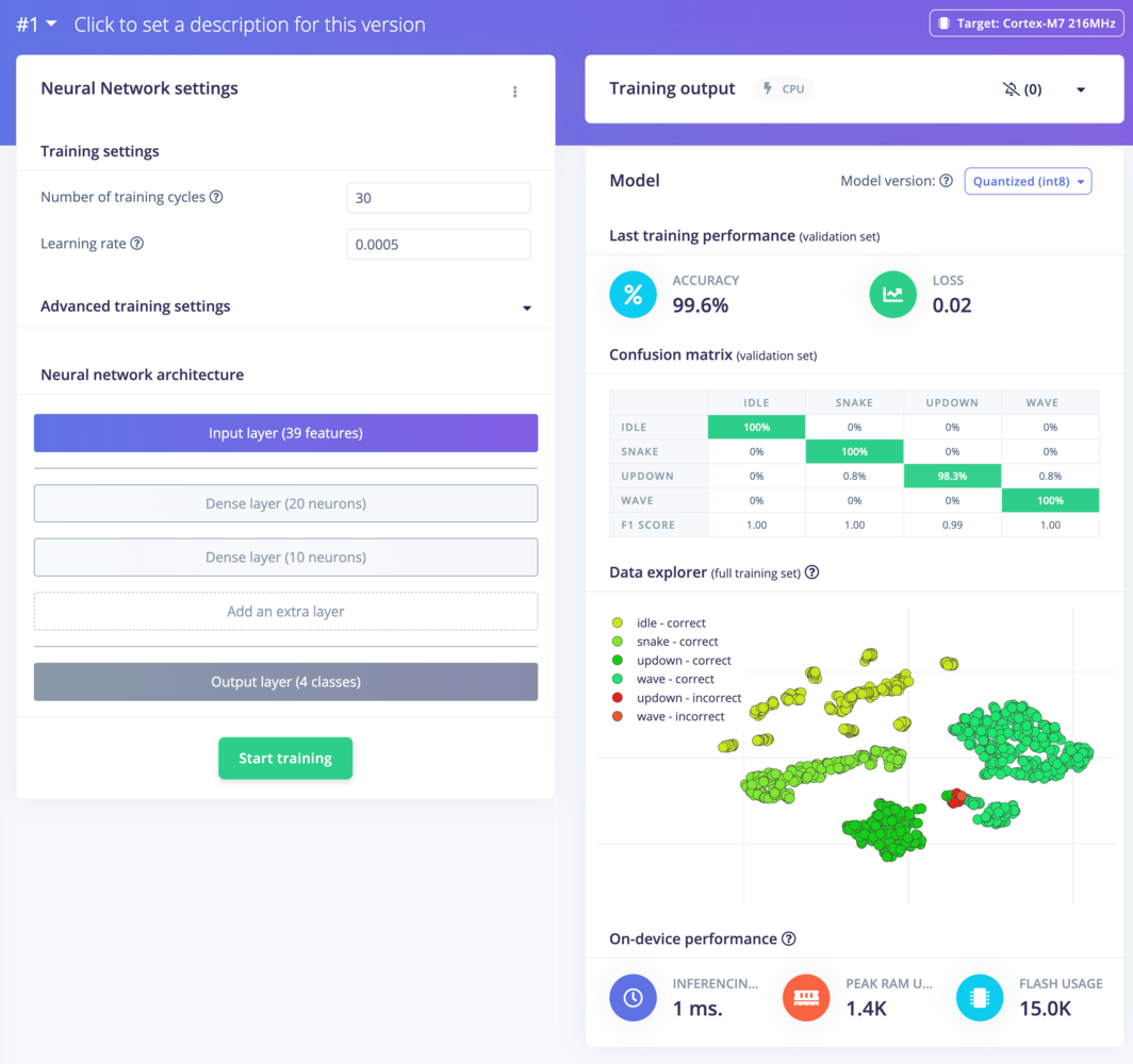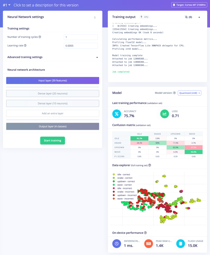 With all data processed it’s time to start training a neural network. Neural networks are a set of algorithms, modeled loosely after the human brain, that are designed to recognize patterns. The network that we’re training here will take the signal processing data as an input, and try to map this to one of the four classes. So how does a neural network know what to predict? A neural network consists of layers of neurons, all interconnected, and each connection has a weight. One such neuron in the input layer would be the height of the first peak of the X-axis (from the signal processing block); and one such neuron in the output layer would bewave (one the classes). When defining the neural network all these connections are initialized randomly, and thus the neural network will make random predictions. During training, we then take all the raw data, ask the network to make a prediction, and then make tiny alterations to the weights depending on the outcome (this is why labeling raw data is important).