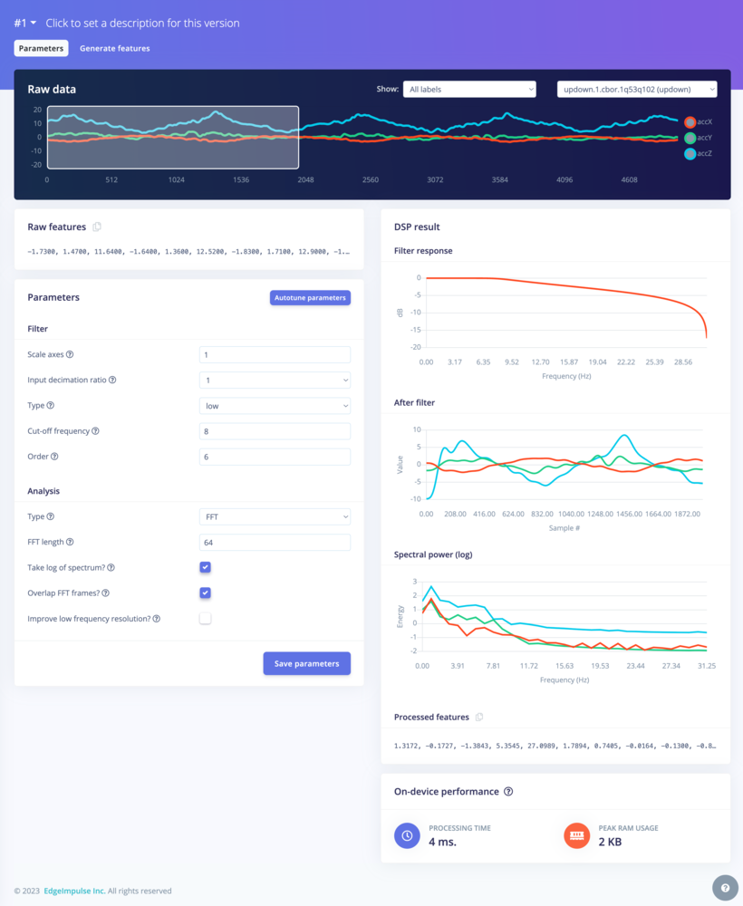 To configure your signal processing block, click Spectral features in the menu on the left. This will show you the raw data on top of the screen (you can select other files via the drop down menu), and the results of the signal processing through graphs on the right. For the spectral features block you’ll see the following graphs:- Filter response - If you have chosen a filter (with non zero order), this will show you the response across frequencies. That is, it will show you how much each frequency will be attenuated.
