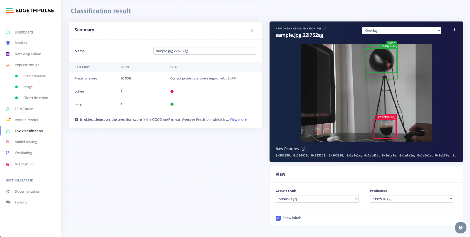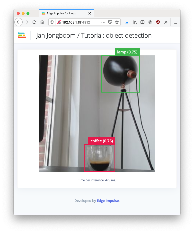With the impulse designed, trained and verified you can deploy this model back to your device. This makes the model run without an internet connection, minimizes latency, and runs with minimum power consumption. Edge Impulse can package up the complete impulse - including the preprocessing steps, neural network weights, and classification code - in a single C++ library or model file that you can include in your embedded software. Running the impulse on your Raspberry Pi 4 or Jetson Nano From the terminal just runedge-impulse-linux-runner. This will build and download your model, and then run it on your development board. If you’re on the same network you can get a view of the camera, and the classification results directly from your dev board. You’ll see a line like: