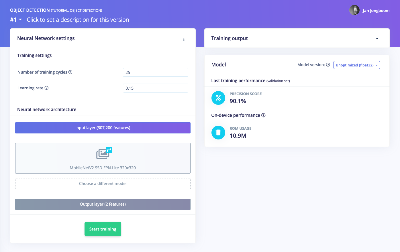 You can view the finished project, including all data, signal processing and machine learning blocks here: Tutorial: object detection.