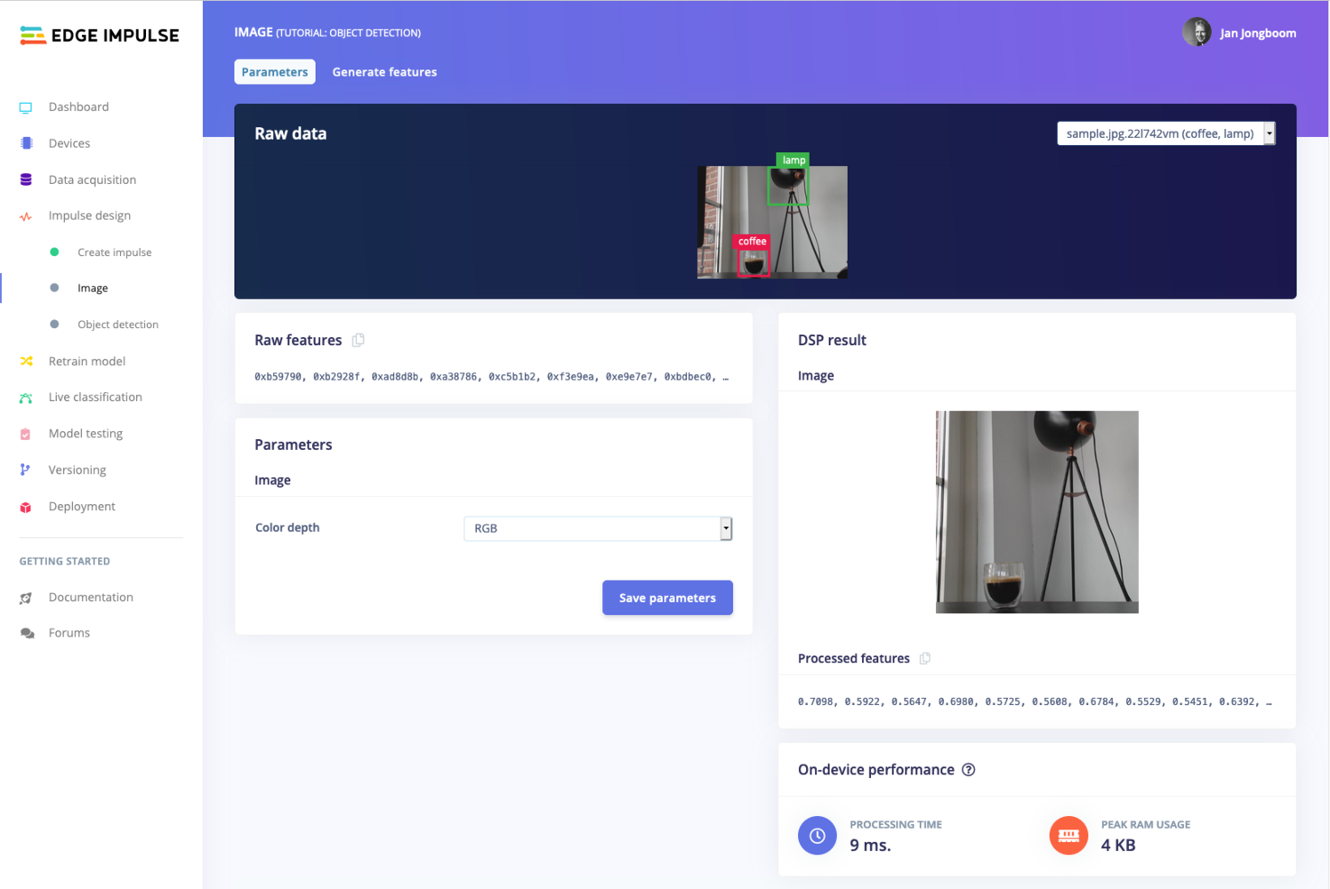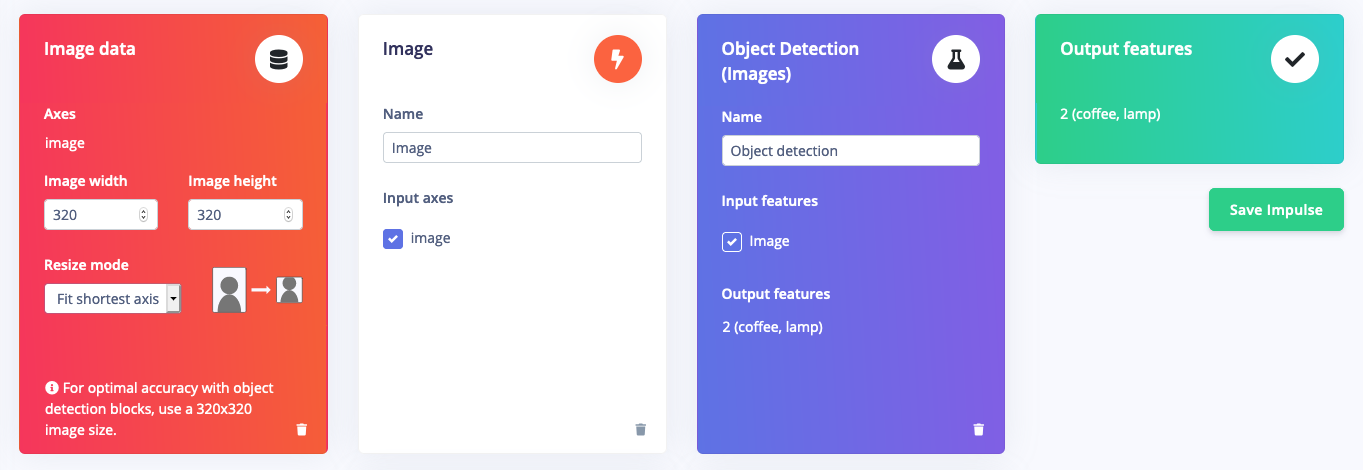 With the training set in place you can design an impulse. An impulse takes the raw data, adjusts the image size, uses a preprocessing block to manipulate the image, and then uses a learning block to classify new data. Preprocessing blocks always return the same values for the same input (e.g. convert a color image into a grayscale one), while learning blocks learn from past experiences. For this tutorial we’ll use the ‘Images’ preprocessing block. This block takes in the color image, optionally makes the image grayscale, and then turns the data into a features array. If you want to do more interesting preprocessing steps - like finding faces in a photo before feeding the image into the network -, see the Building custom processing blocks tutorial. Then we’ll use a ‘Transfer Learning’ learning block, which takes all the images in and learns to distinguish between the two (‘coffee’, ‘lamp’) classes. In the studio go to Create impulse, set the image width and image height to320, the ‘resize mode’ to Fit shortest axis and add the ‘Images’ and ‘Object Detection (Images)’ blocks. Then click Save impulse.