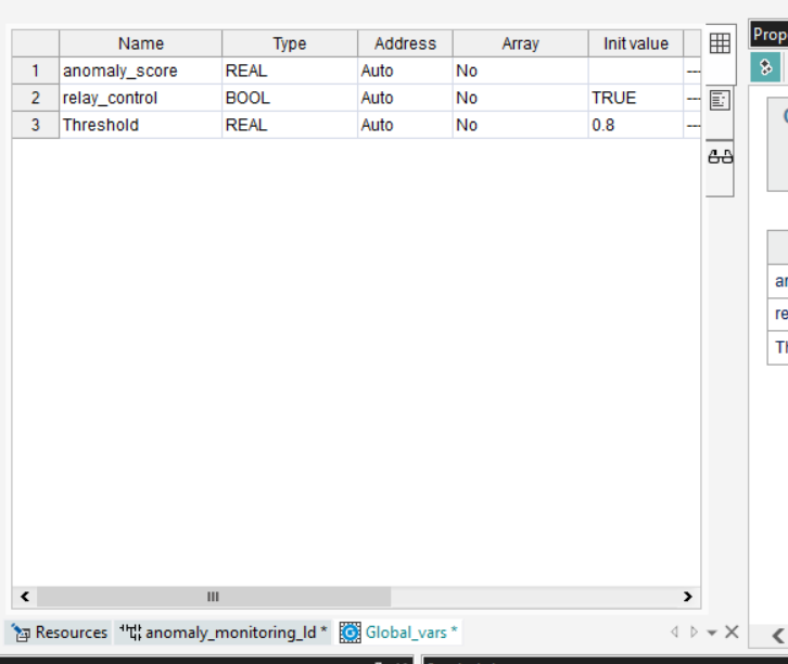 In the Arduino PLC IDE, navigate to theGlobal_vars section to create shared variables that will store the results from the Edge Impulse inference. Define a shared variable for the anomaly score or classification output of the model.