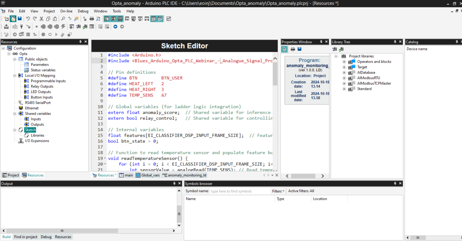 Use the Watch window in the PLC IDE to monitor the shared variables and ensure the system responds correctly to anomalies detected by the machine learning model. Upload the Arduino Sketch:- Ensure your Arduino sketch is uploaded to the Opta PLC to provide the inference results.