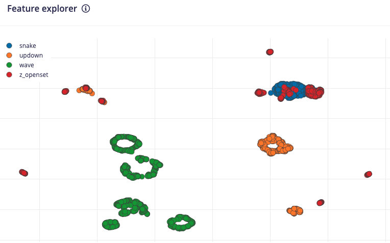 Afterwards the ‘Feature explorer’ will load. This is a plot of all the extracted features against all the generated windows. You can use this graph to compare your complete data set. A good rule of thumb is that if you can visually separate the data on a number of axes, then the machine learning model will be able to do so as well.