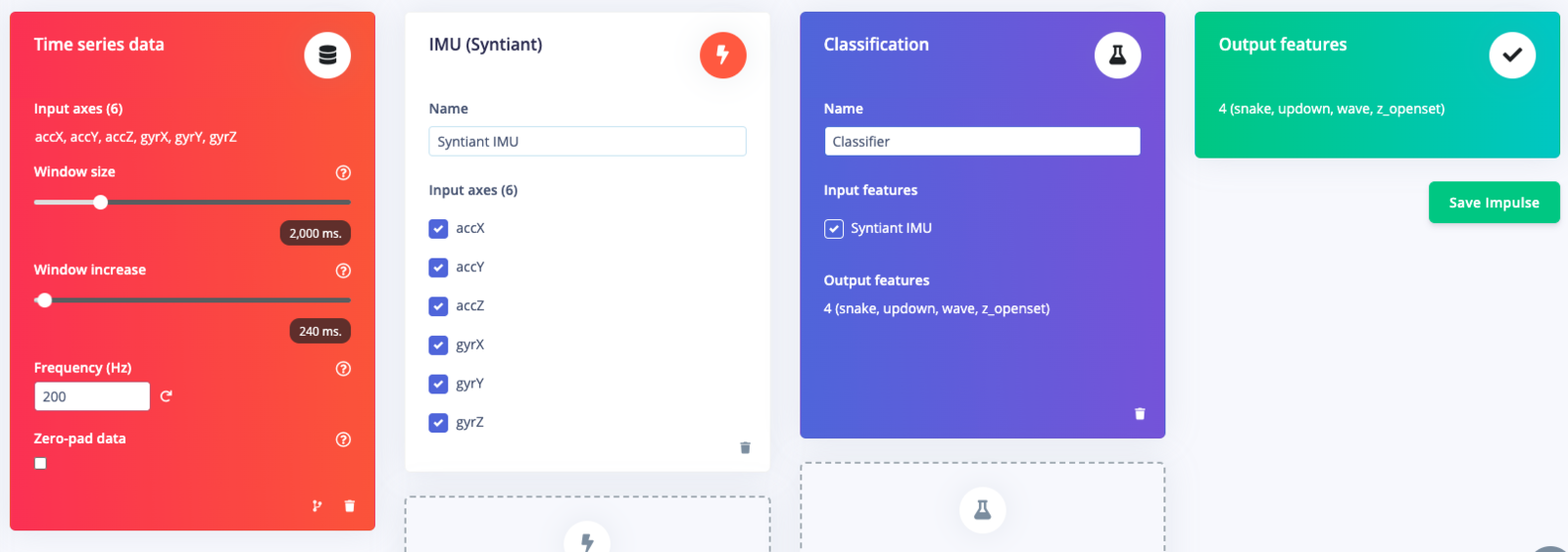 With the training set in place you can design an impulse. An impulse takes the raw data, slices it up in smaller windows, uses signal processing blocks to extract features, and then uses a learning block to classify new data. Signal processing blocks always return the same values for the same input and are used to make raw data easier to process, while learning blocks learn from past experiences. For this tutorial we’ll use the ‘IMU Syntiant’ signal processing block. This block rescales raw data to 8 bits values to match the NDP chip input requirements. Then we’ll use a ‘Neural Network’ learning block, that takes these generated features and learns to distinguish between our different classes (circular or not). In the studio go to Create impulse, set the window size to2000 (you can click on the 2000 ms. text to enter an exact value), the window increase to 240, the frequency to ‘200’ and add the ‘IMU Syntiant’ and ‘Classification (Keras)’ blocks. Then click Save impulse.