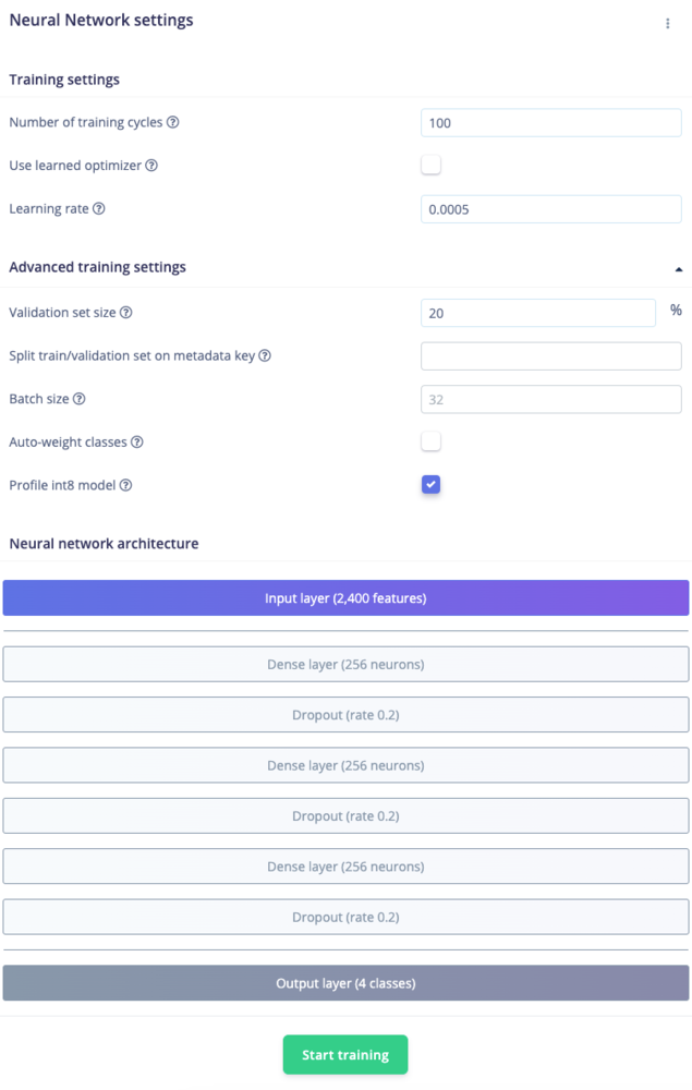 With all data processed it’s time to start training a neural network. Neural networks are algorithms, modeled loosely after the human brain, that can learn to recognize patterns that appear in their training data. The network that we’re training here will take the processing block features as an input, and try to map this to the classes — ‘updown’, ‘wave’, ‘snake’, ‘idle’, or ‘z_openset’. Click on NN Classifier in the left hand menu. You’ll see the following page: