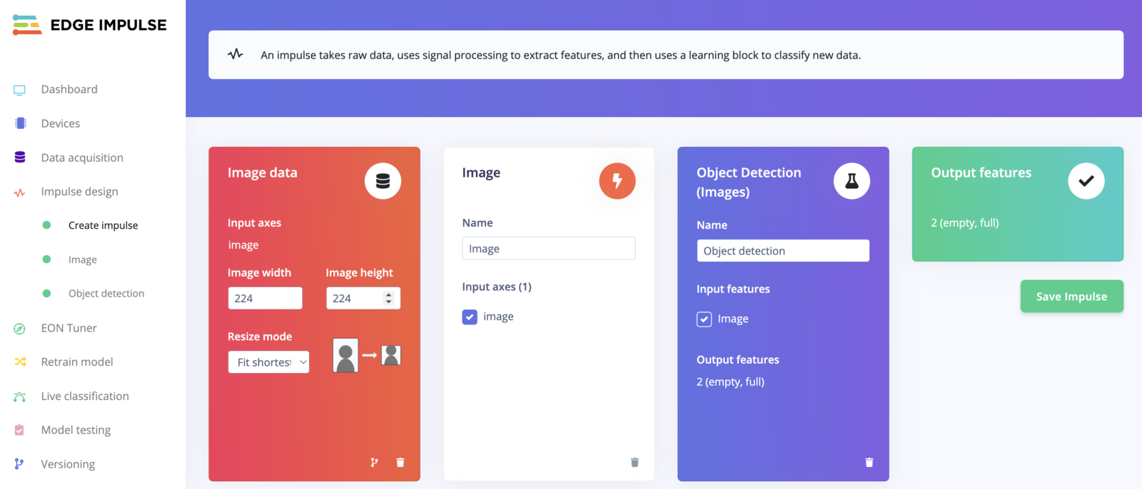 Create an Impulse with an Object Detection (Images) or Transfer Learning (Images) block.