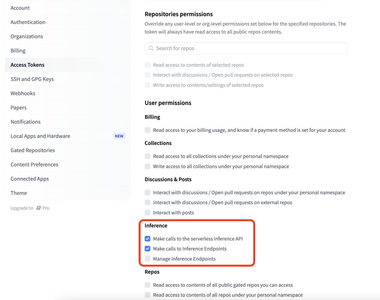 You need a HuggingFace API Key/Access Token. See below to create one and set the permissions.