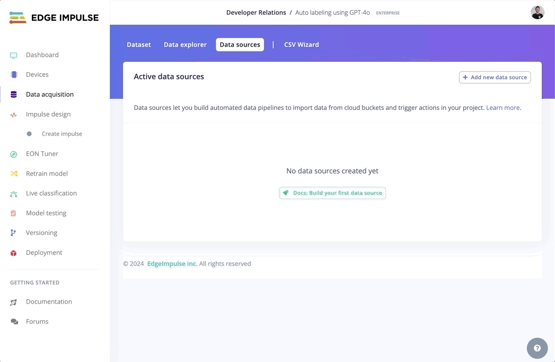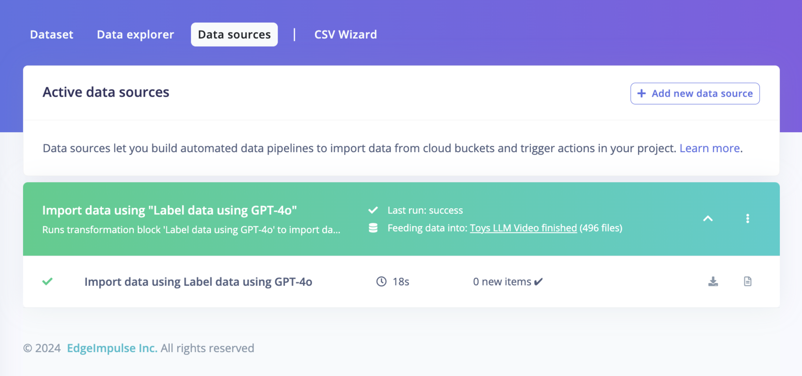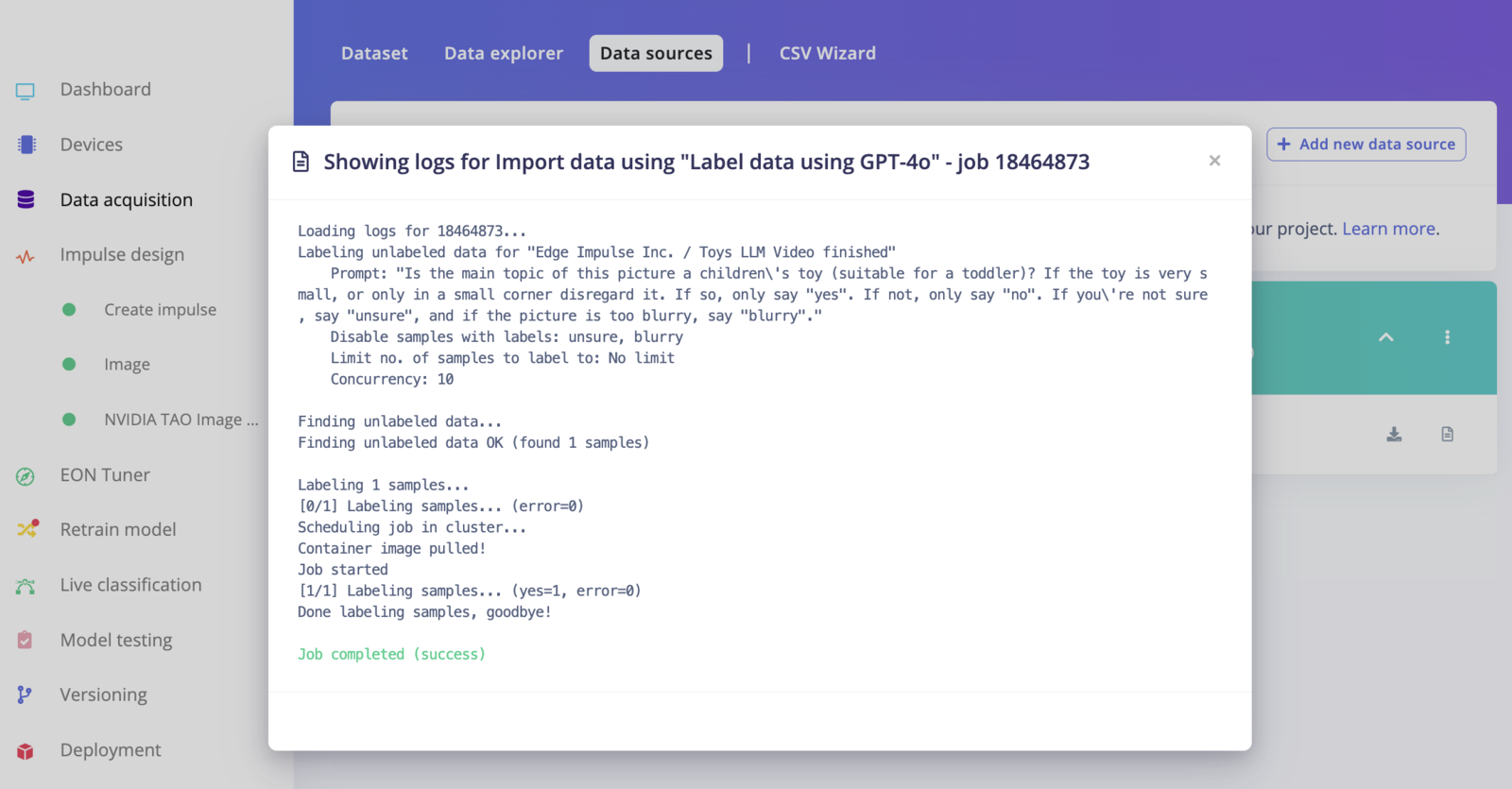 The latest multimodal LLMs are incredibly powerful but too large for many practical applications. At Edge Impulse, we enable the transfer of knowledge from these large models to smaller, specialized models that run efficiently on edge devices. Our “Label image data using GPT-4o” block is available for enterprise customers, allowing you to experiment with this technology. For further assistance, visit our forum.Examples & Resources